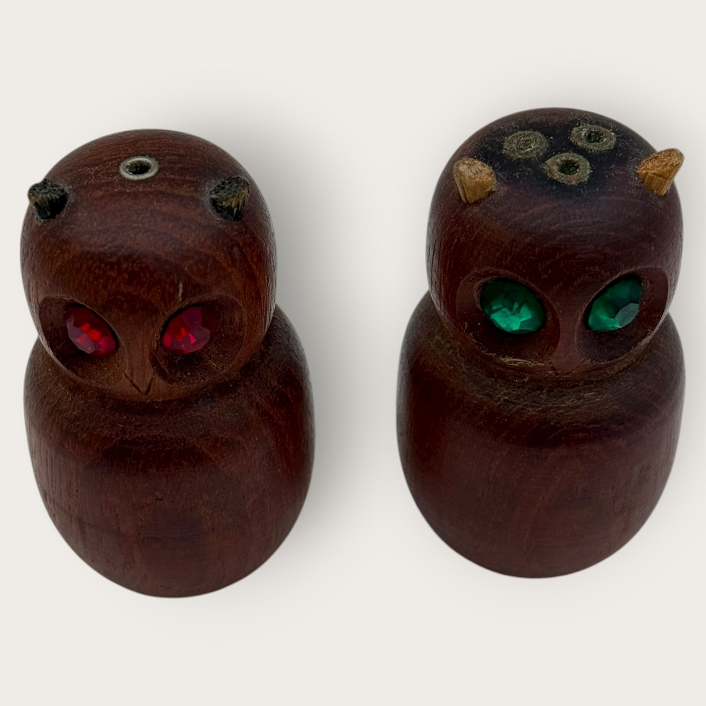 Salt and pepper set in teak wood from the 1960s, birds / owls with green and red eyes, appears nicely patinated and without bottom plugs.