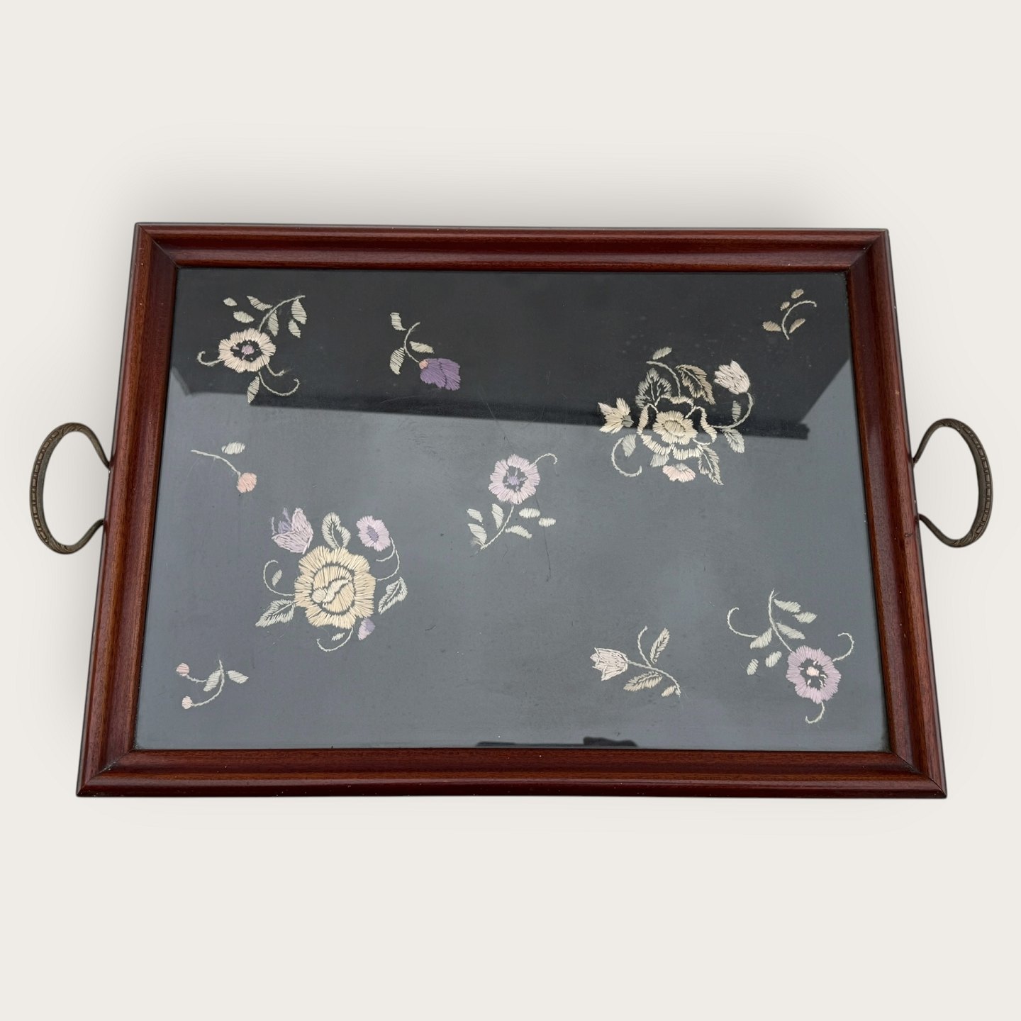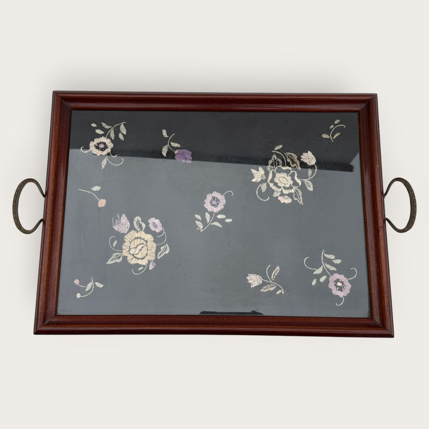 Tray with metal handle and embroidery under glass plate, 35x47cm (without handle) *nice condition*