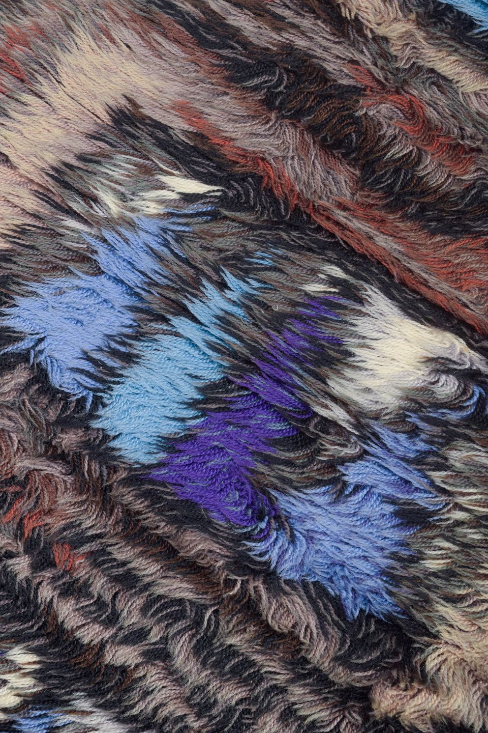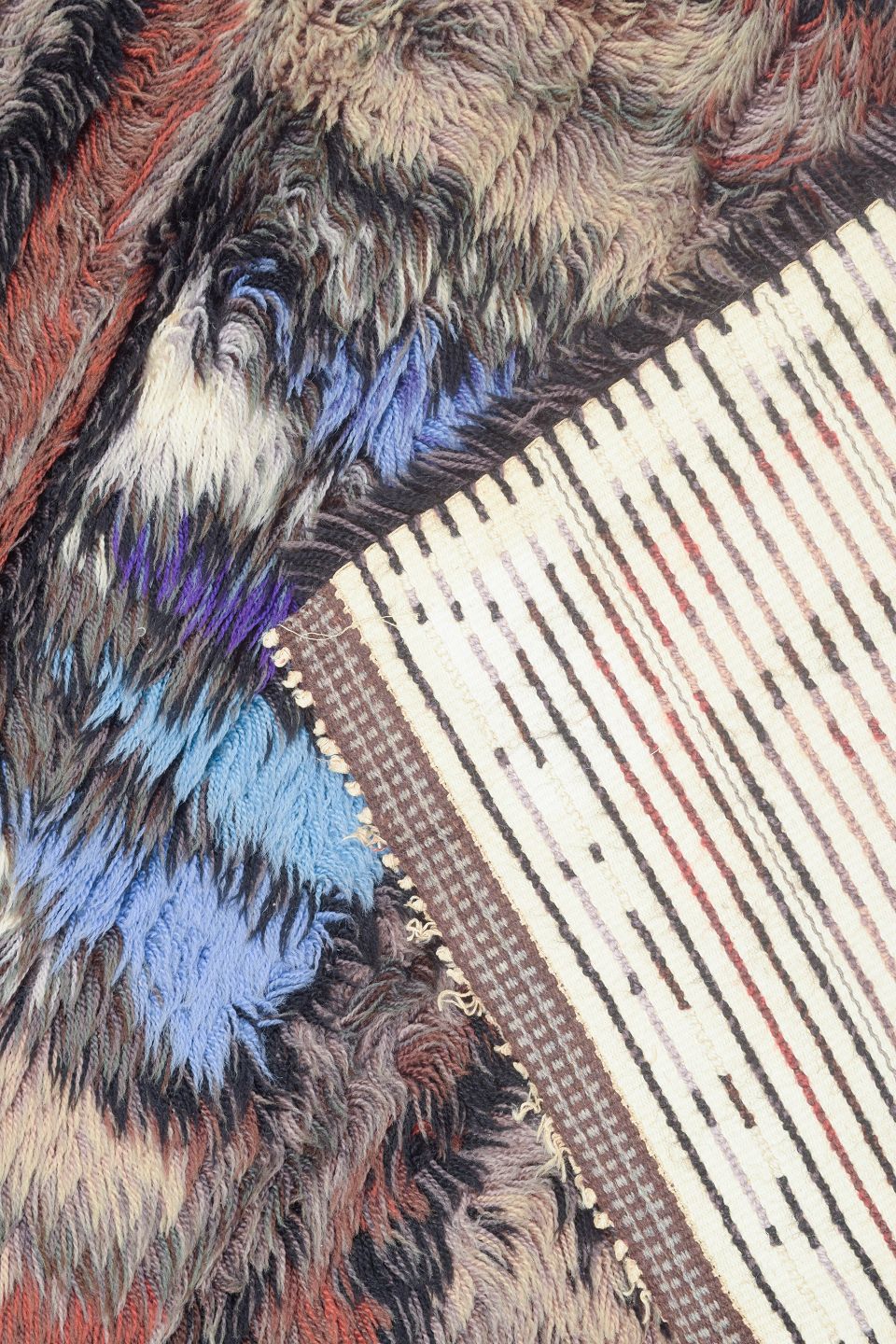 Hand-knotted rya carpet in pure wool with a geometric pattern in shades of blue, purple, brown, and beige. A characteristic design from the period, using contrast and rhythmic forms to create depth and movement within the textile.