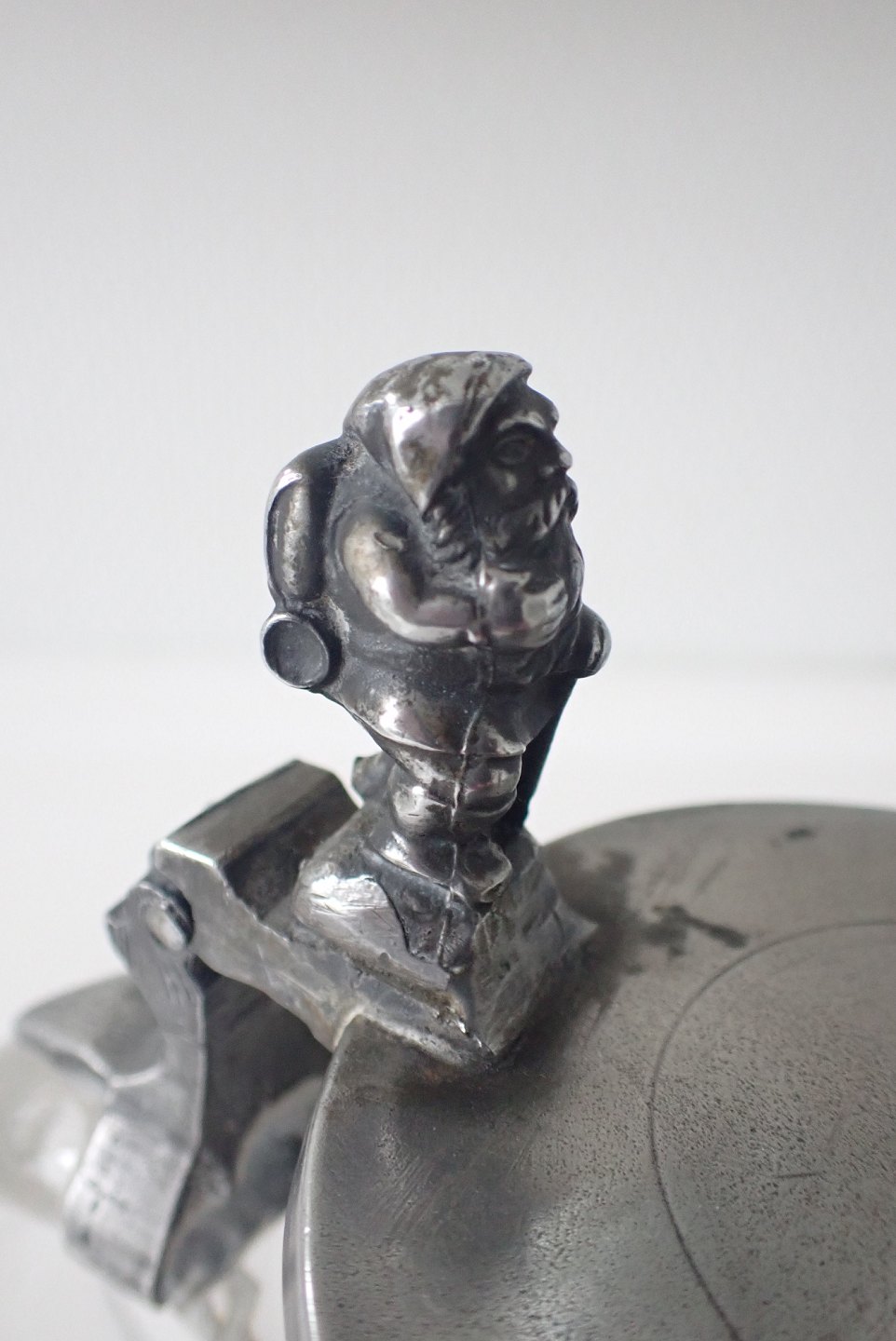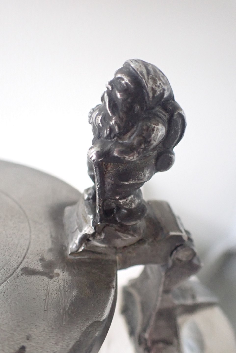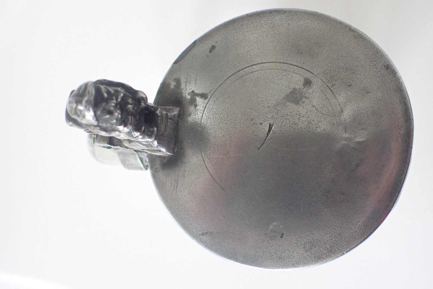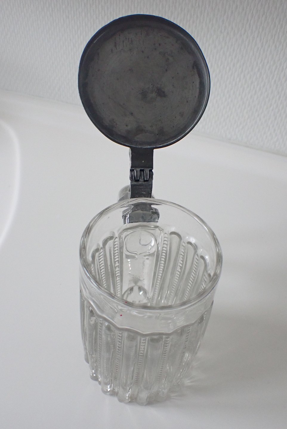 Text available in Danish: Nisse ølkrus - klart riflet glaskrus med hank og med tinlåg. Studsen på tinlåget er udformet som en nisse med rygsæk og stav. Tyskland ca. 1880. 1 liter. Højde med låg u. studs: 13,2 cm. Med studs: 17 cm. I pæn stand i forhold til alder.