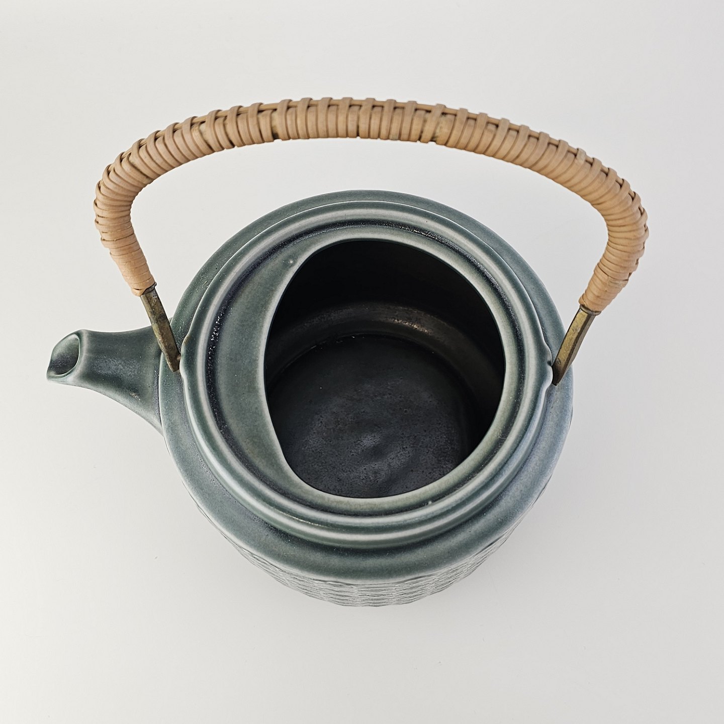Stel i blågrønt stentøj med blomster motiver og håndtag i messing beklædt med bambusflet