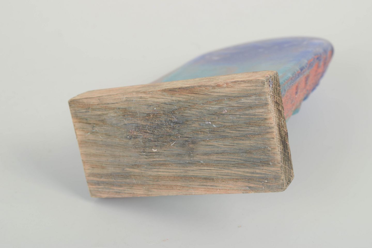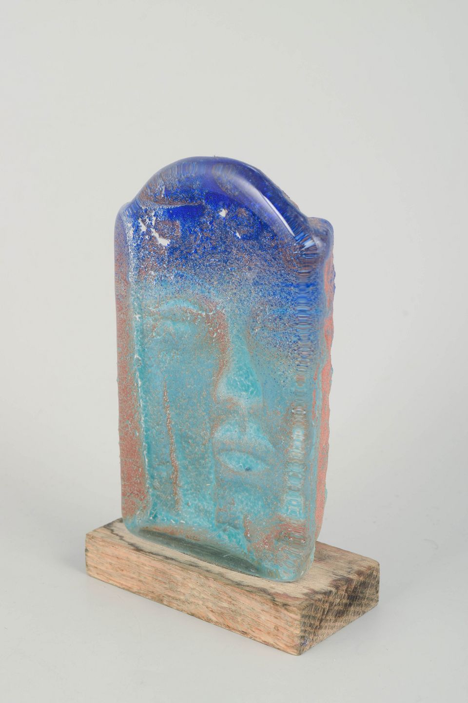 Unique handmade glass sculpture depicting a stylised face, executed in solid glass with an iridescent surface in blue, turquoise, and pink tones. Mounted on a wooden base. A characteristic example of Ekegren’s experimental approach to colour and texture in glass during the 1980s.