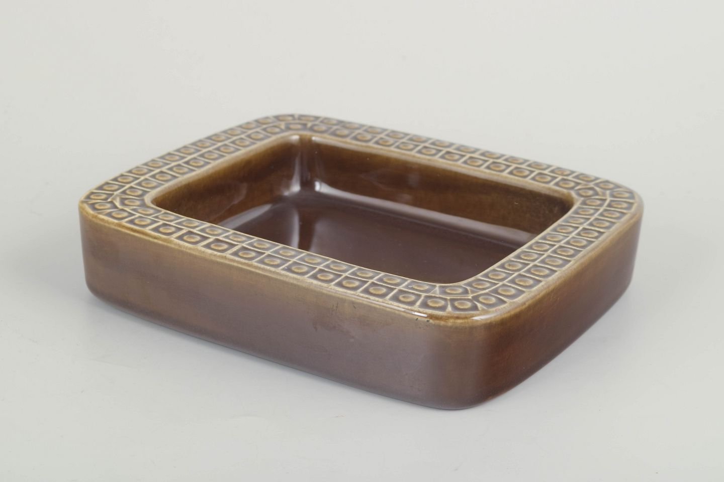 Ceramic dish in brown glaze with the characteristic geometric relief pattern along the rim. The Kub series combines functional design with modernist elegance, and this piece exemplifies Nylund’s refined sense of proportion and material.