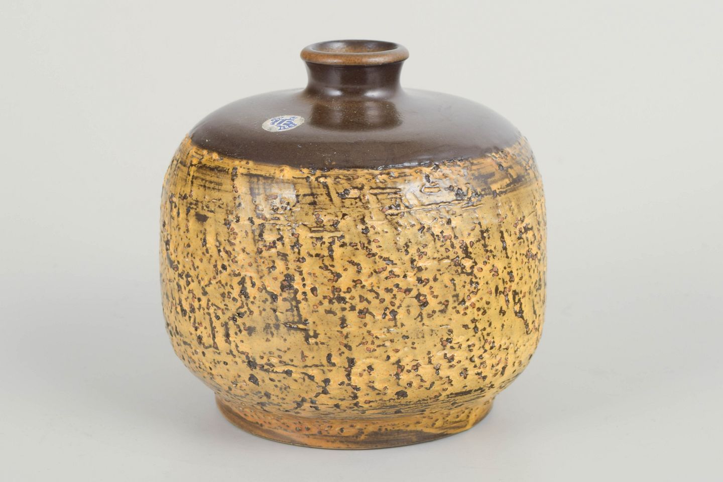 Hand-thrown stoneware vase with a cylindrical body and small neck, decorated in a vivid yellow-brown glaze with dark textured markings giving the surface a striking rustic character. A fine example of Andersson’s craftsmanship and the experimental glazing aesthetics of Upsala Ekeby during the 1960s.