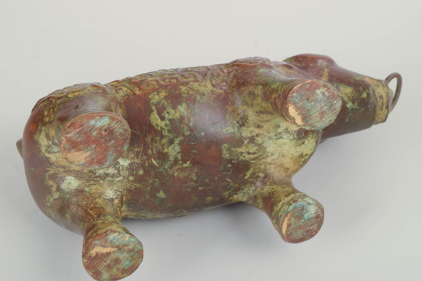 Bronze sculpture shaped as an animal, richly ornamented with intricate surface decorations and a fine patina in green and reddish tones. This type of “zun” was traditionally used for wine in ritual ceremonies in ancient China. A fine example of classical bronze artistry with a distinctive form and historical presence.