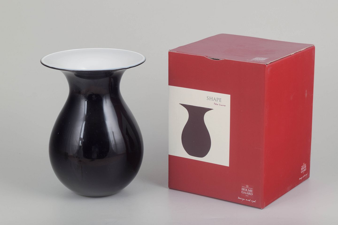 Elegant hand-blown vase in black and white glass from the Shape series, designed by Peter Svarrer for Holmegaard. Classic form with soft curved silhouette and wide opening. Original box included.
