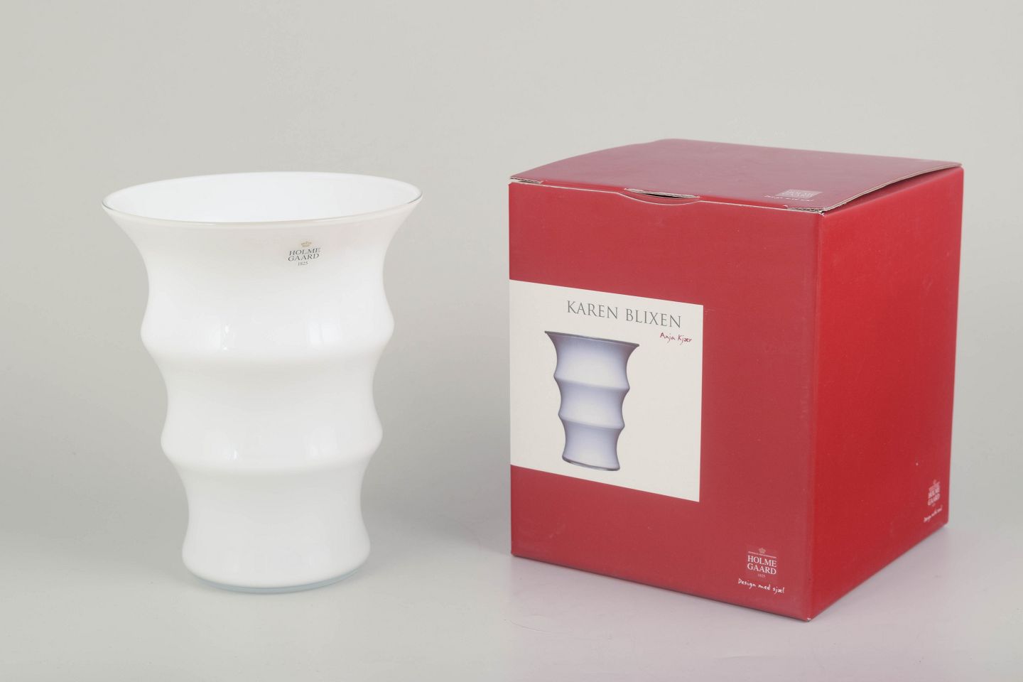 Elegant hand-blown vase in opal white glass from the Karen Blixen series, designed by Anja Kjær for Holmegaard. Distinctive undulating form with a soft organic silhouette. Original box included.