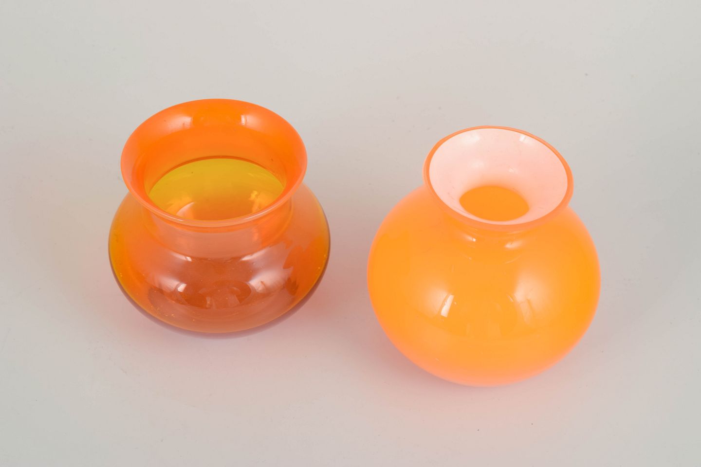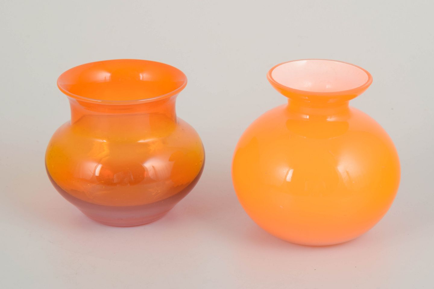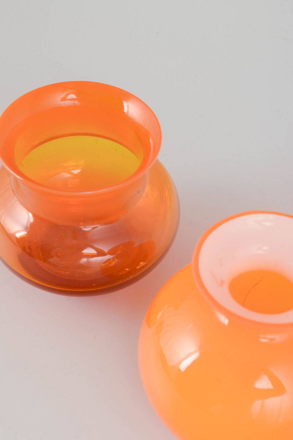 Two mouth-blown vases in vibrant orange glass with softly rounded forms and slightly flared necks. Classic Scandinavian glass design with expressive 1970s colour tones and fine craftsmanship.