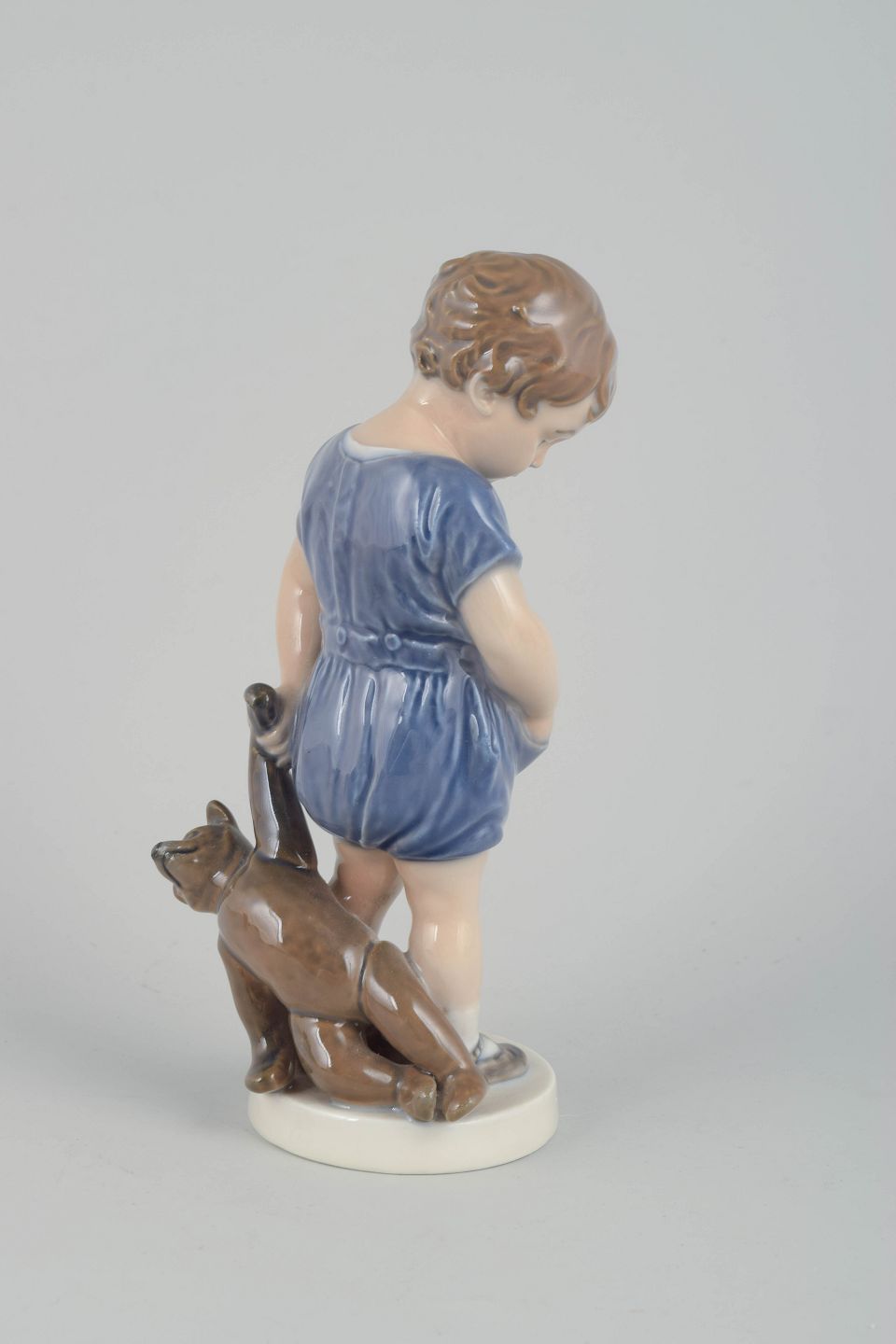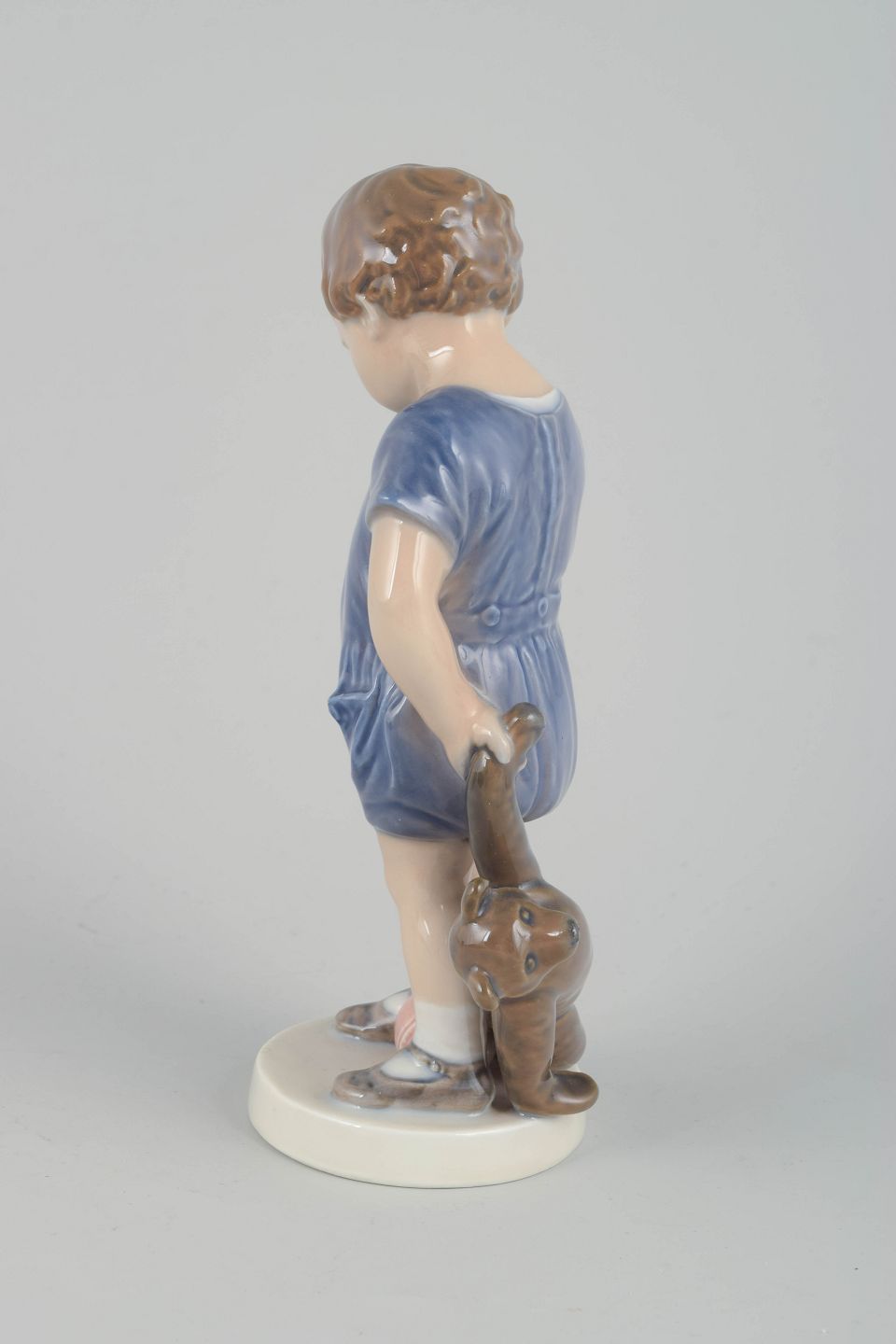 Porcelain figurine of a small boy in a blue romper with a teddy bear beside him and a ball at his feet. A charming and period-typical Royal Copenhagen piece with soft pastel tones and natural expression.
