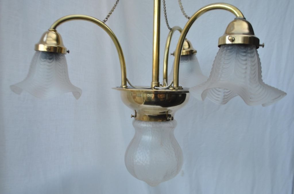 Danish Art Nouveau lamp in brass with four domes, approx. 1910. Center dome onion-shaped in frosted glass. 3 ruffled frosted lamp glasses in each light arm. With three hanging chains. H.: 80 cm. Dia.: 50 cm. All domes from Funen Glassworks. Fantastic condition. Provenance: Samsø.