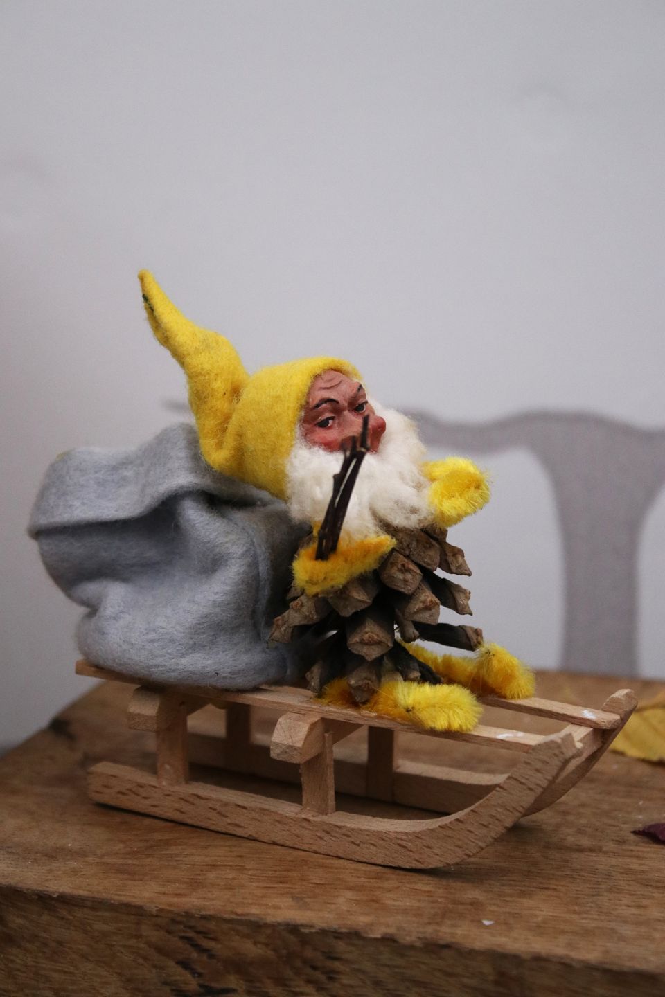 Old gnome on a wooden sled...