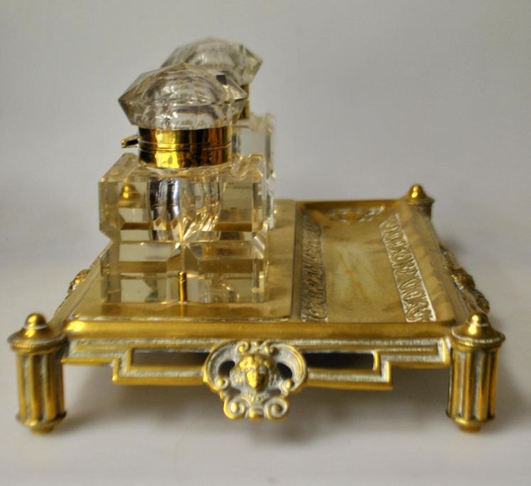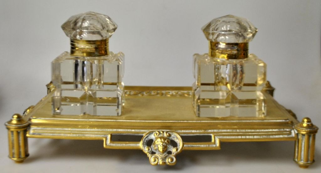 Antique writing set in brass with crystal containers, 19th century Germany.