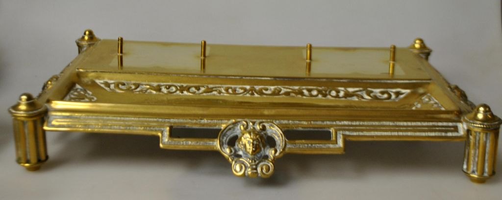 Antique writing set in brass with crystal containers, 19th century Germany. Dish decorated with angel heads. L.: 29 cm. W.: 23 cm. H.: 15 cm.