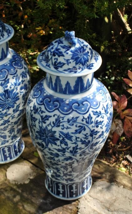 Pair of Chinese lidded jars, blue/white porcelain, 19th century.
