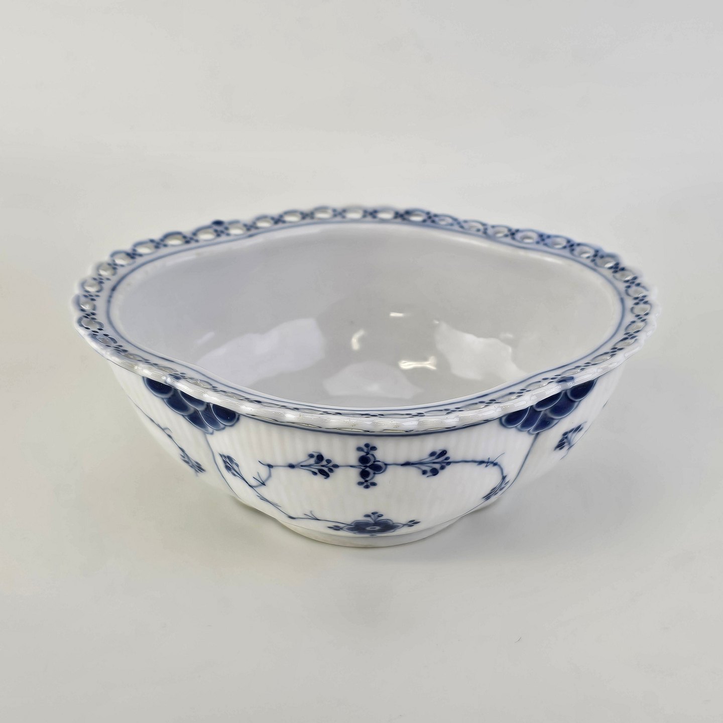 Stellet Musselmalet Helblonde er hvidt porcelæn dekoreret med blå blomster og mønstre. Øverst er porcelænet dekoreret med hulmønster.