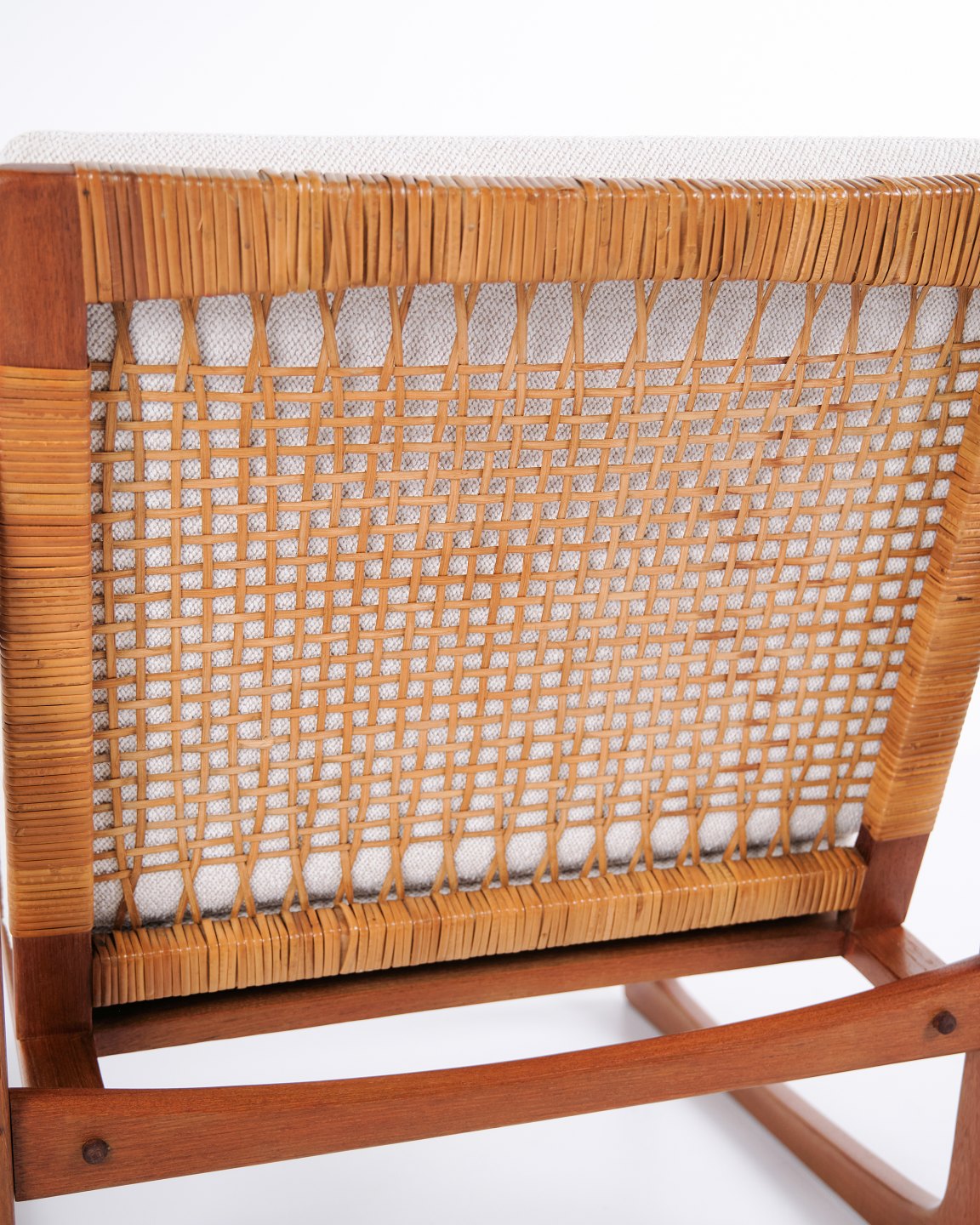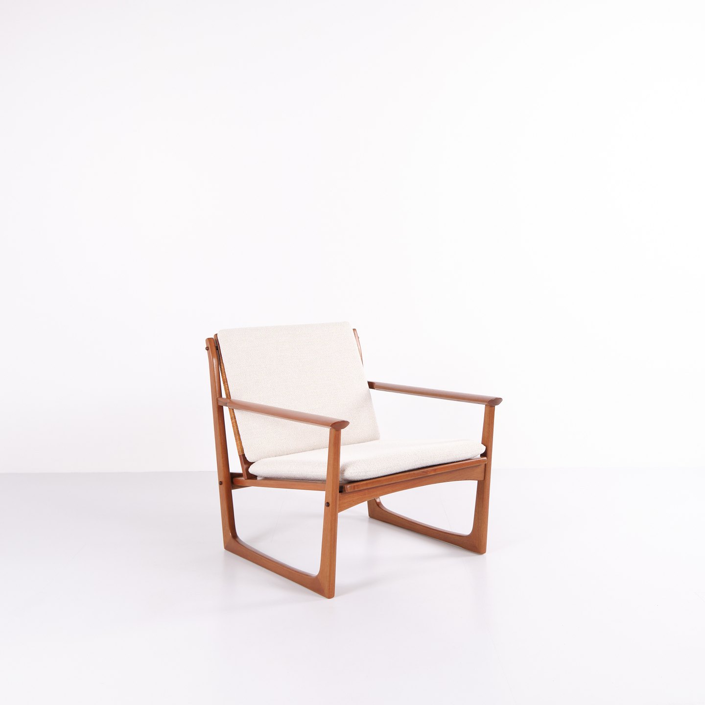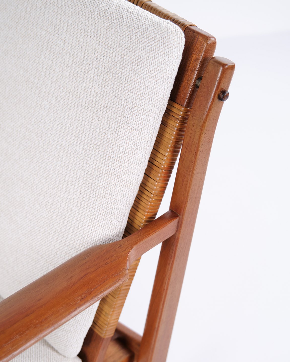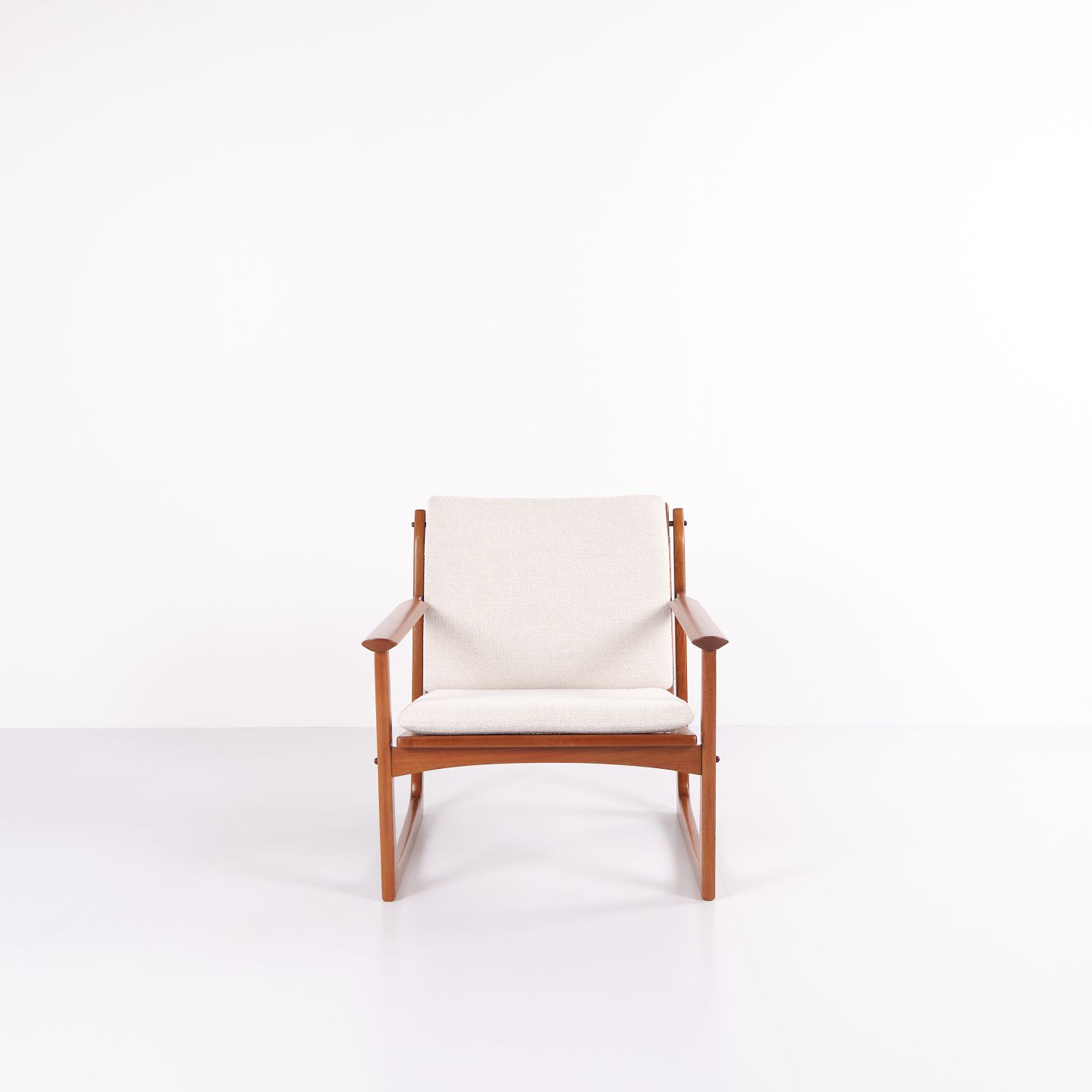 Lounge/Armchair designed by Hans Olsen and produced by Selig in the 1960s. The chair is made of solid teak with beautifully shaped armrests and legs, upholstered in light fabric that highlights the warm wood and the harmonious design.