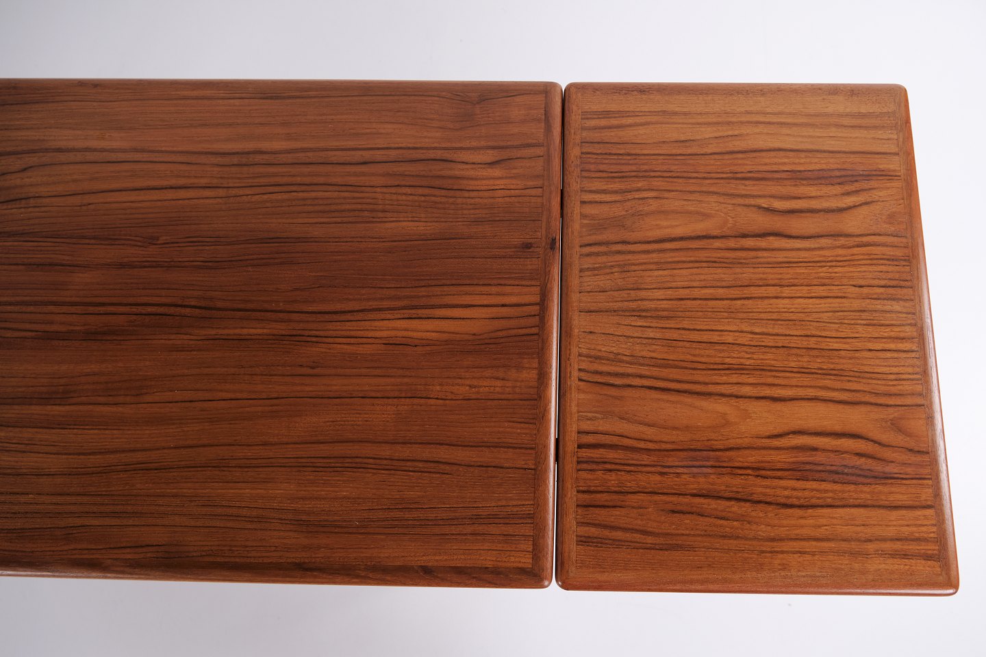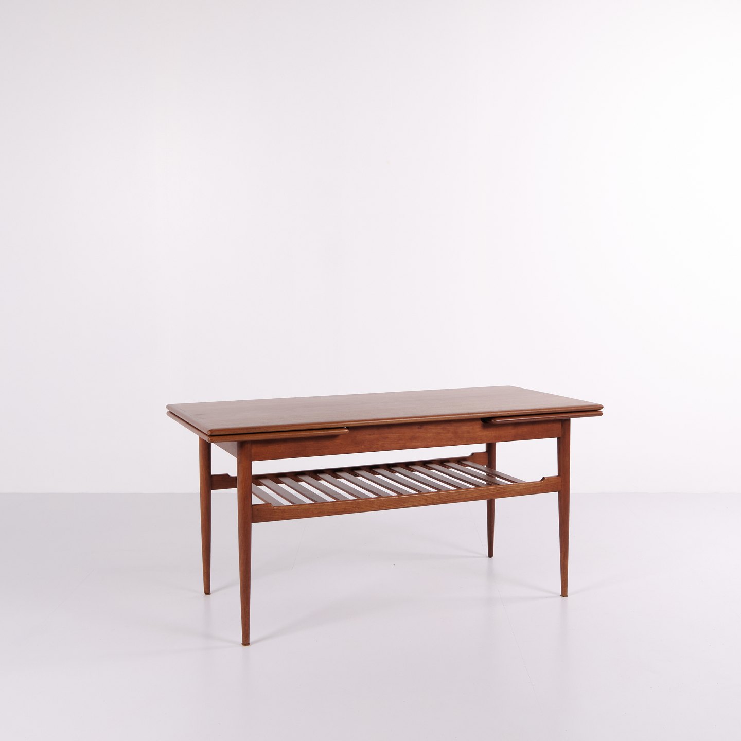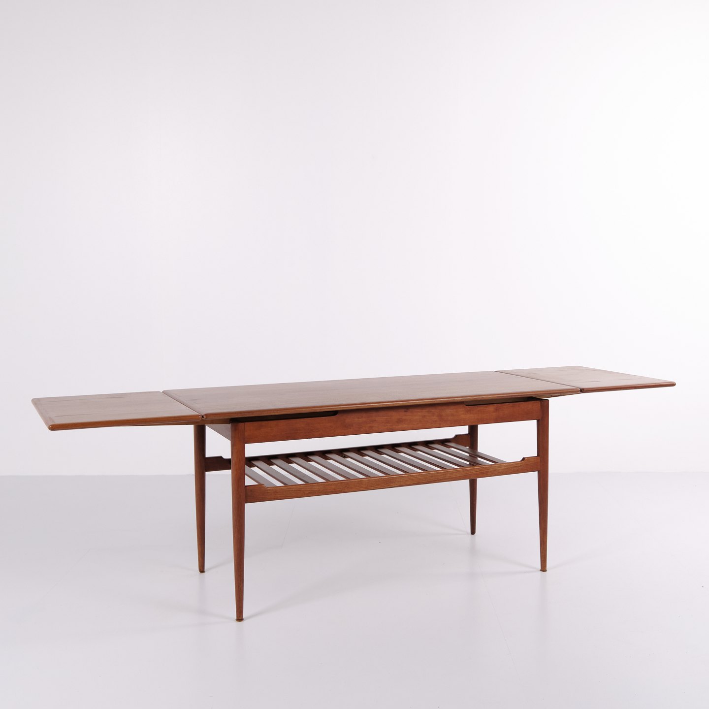 Coffee table from the 1960s, made of teak with a practical shelf and pull-out, providing extra table space as needed.
