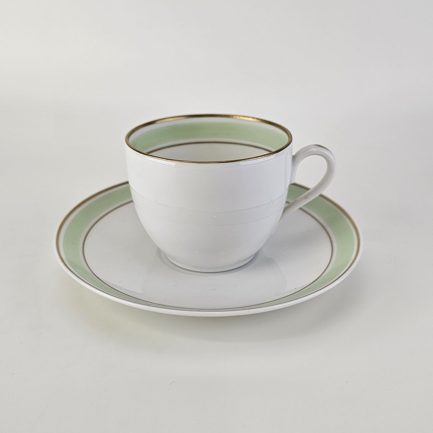 Glat hvidt porcelæn med lysegrøn bord og guldkant