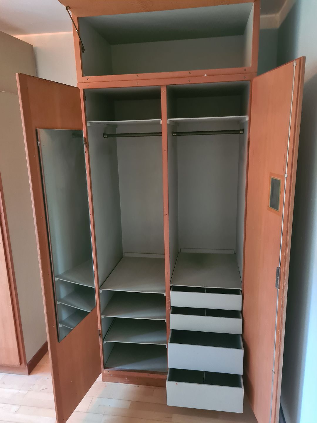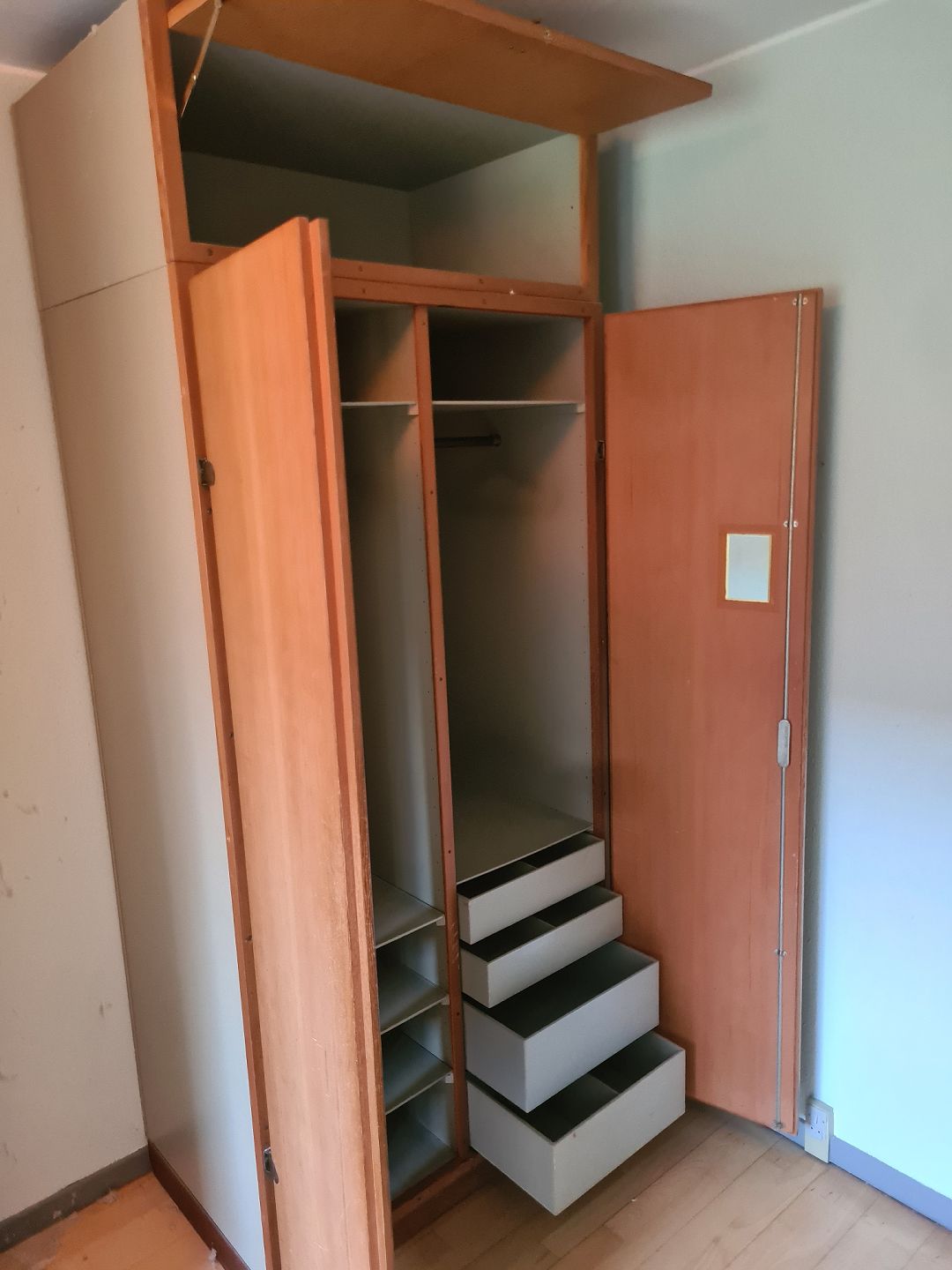 Text available in Danish: Boligens byggeskab fra 1960'erne med låger i Oregon pine designet af Børge Mogensen og Grethe Meyer. Fremstår i pæn brugt stand med uoriginalt spejl på indersiden af lågen og låsen virker, men griber ligesom ikke ordentligt fat. (Kan måske udbedres med lidt snilde) Kan evt. stå sammen med nr. 60675