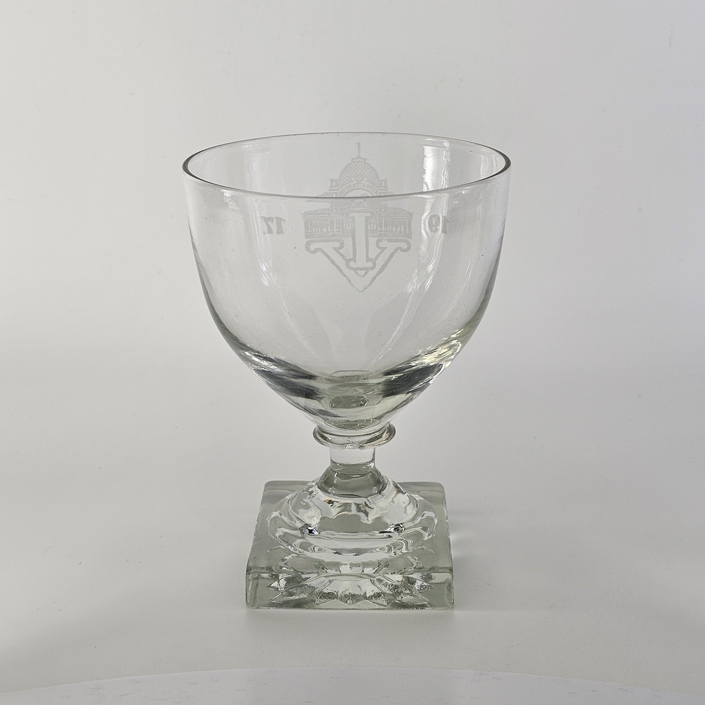 Vinglas med firkantet fod i mundblæst presset glas ætsning med motiv af Tivoli med bogstaverne IV og 1917