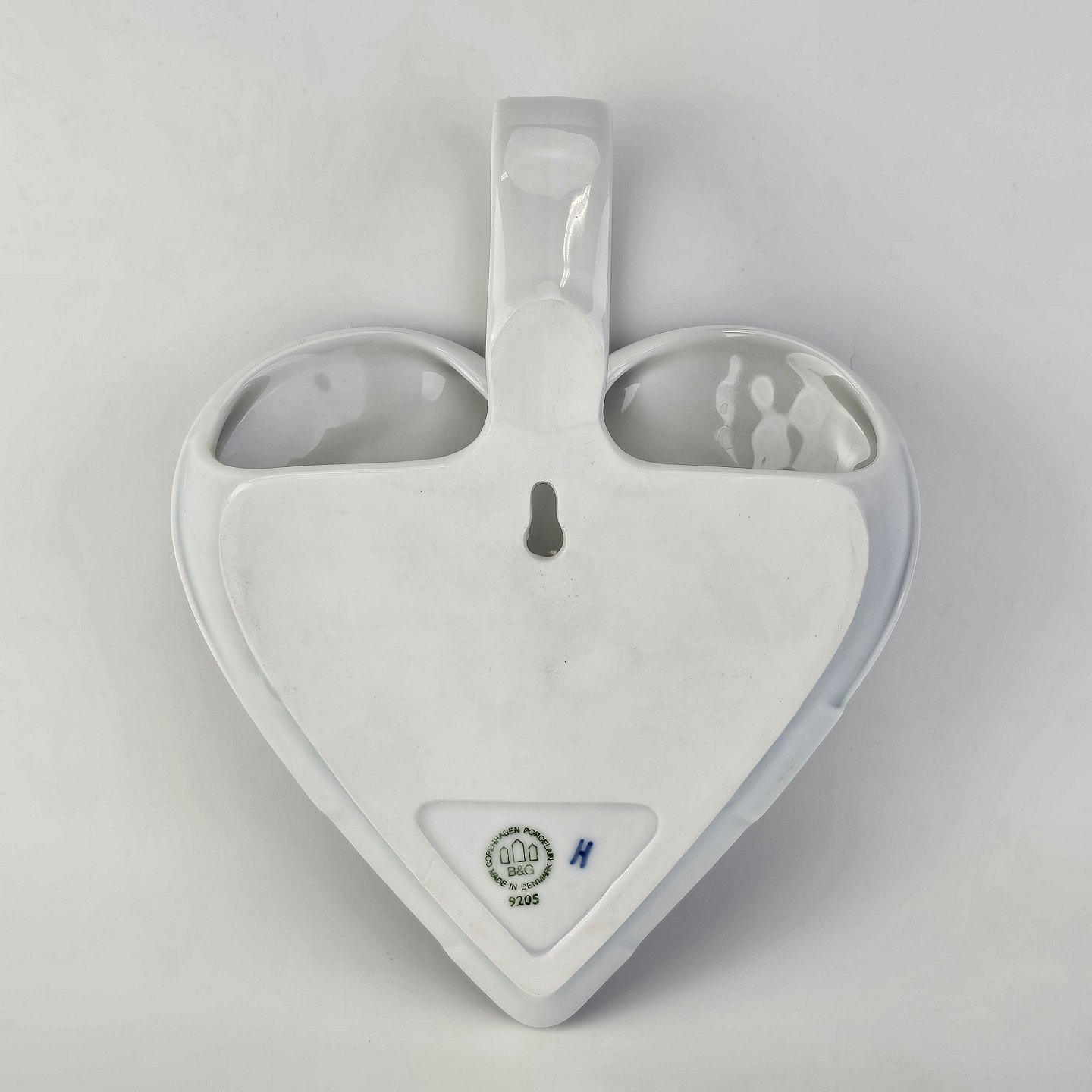 Flettet julehjerte til vægophæng i porcelæn i blå og hvide farver dekoreret med kristtjørn