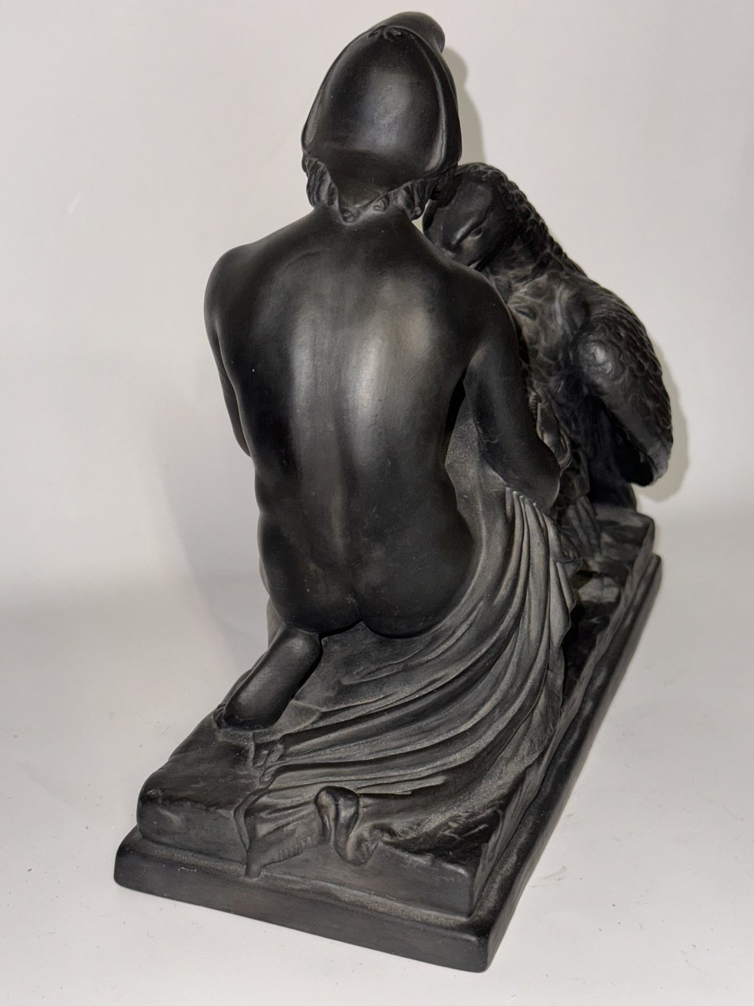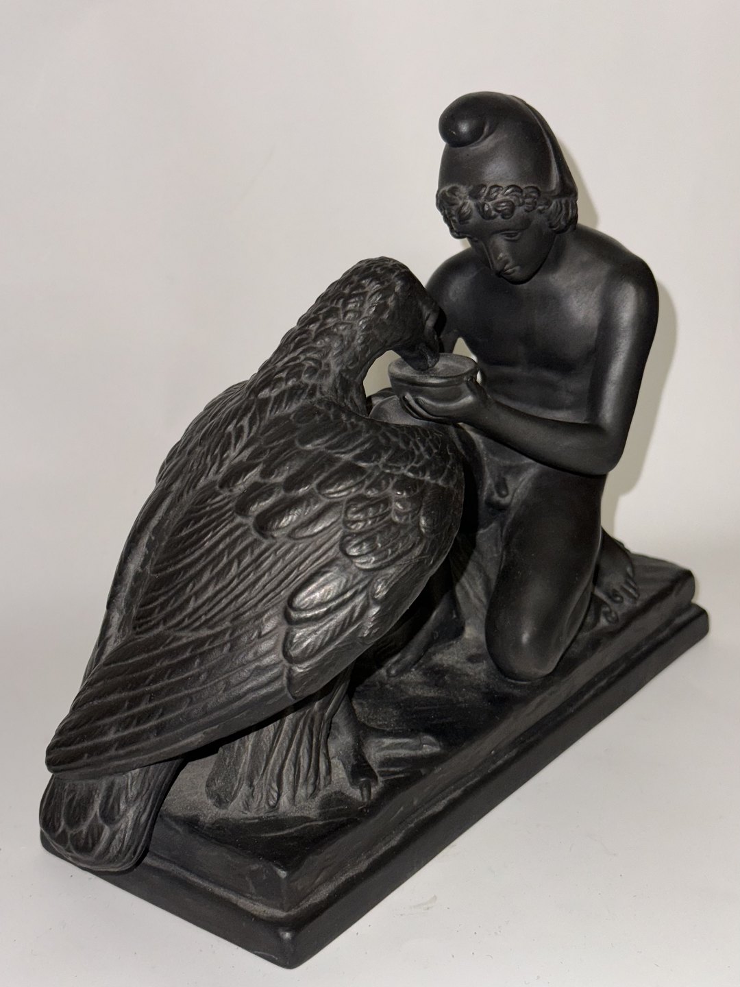 Ceramic figurine (black basalt) depicting Ganymede with Jupiter's eagle by Bertel Thorvaldsen (1770-1844) Designed in Rome 1817-18. This copy from the Copenhagen pottery factory Peter Ipsen was made around 1900. According to Greek mythology, Jupiter's eagle abducts Ganymede in order to make him the cupbearer (servant) of the gods. Factory mark on the bottom with P. Ipsen, KJØBENHAVN ENERET and model number 349. Dimensions: H. 19 cm. The base measures 9 x 22.5 cm