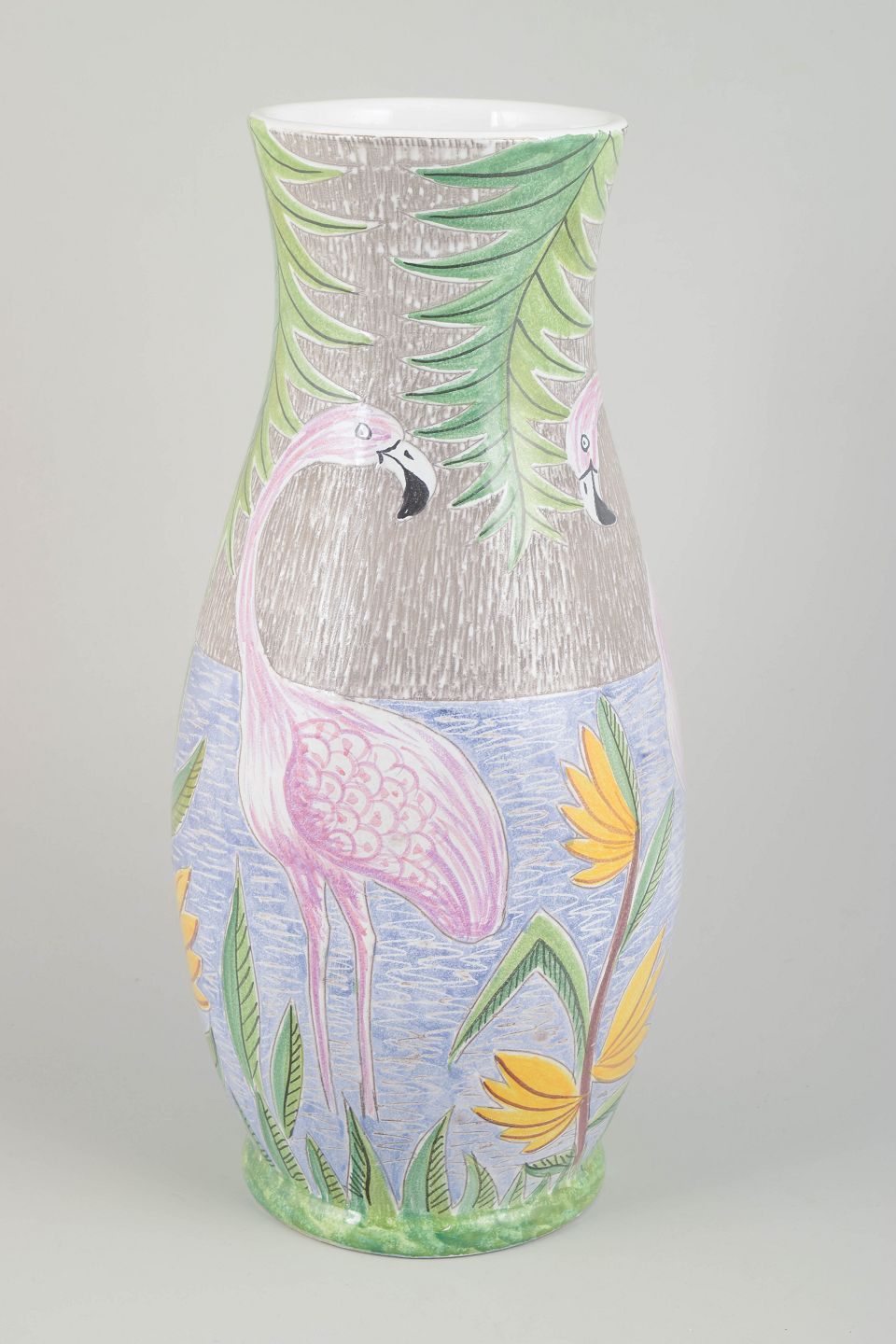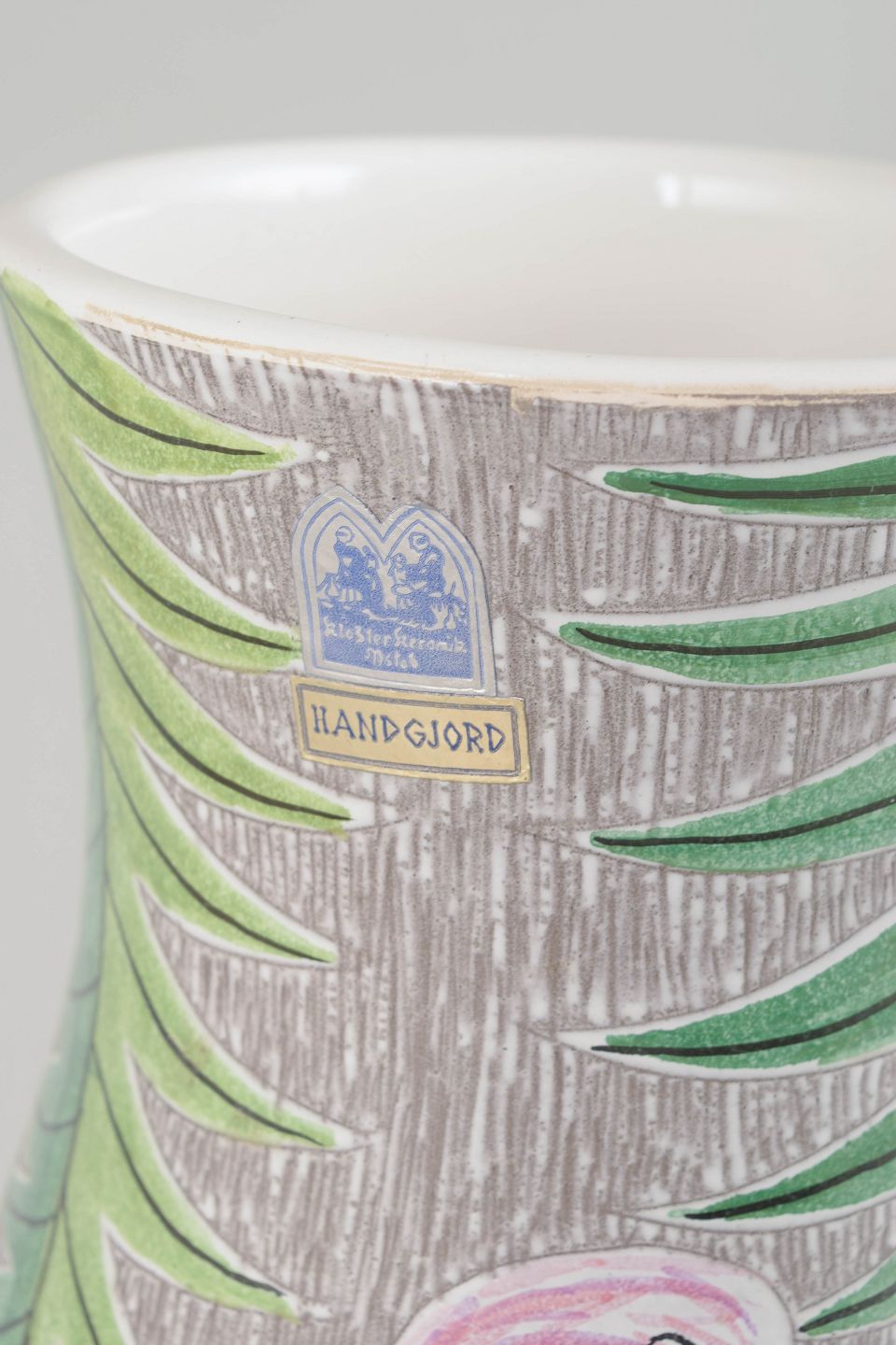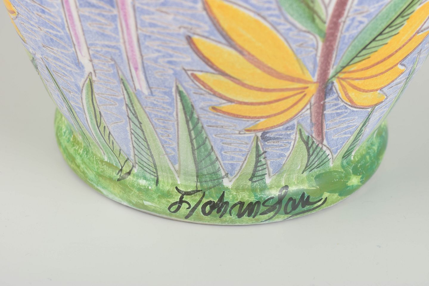 Decorative hand-painted ceramic vase featuring tropical motifs of flamingos and exotic flowers in pastel tones. Signed “Holmén” and F. Johansson at the base. A striking example of Holmén’s colourful and figurative style from Kloster Keramik.
