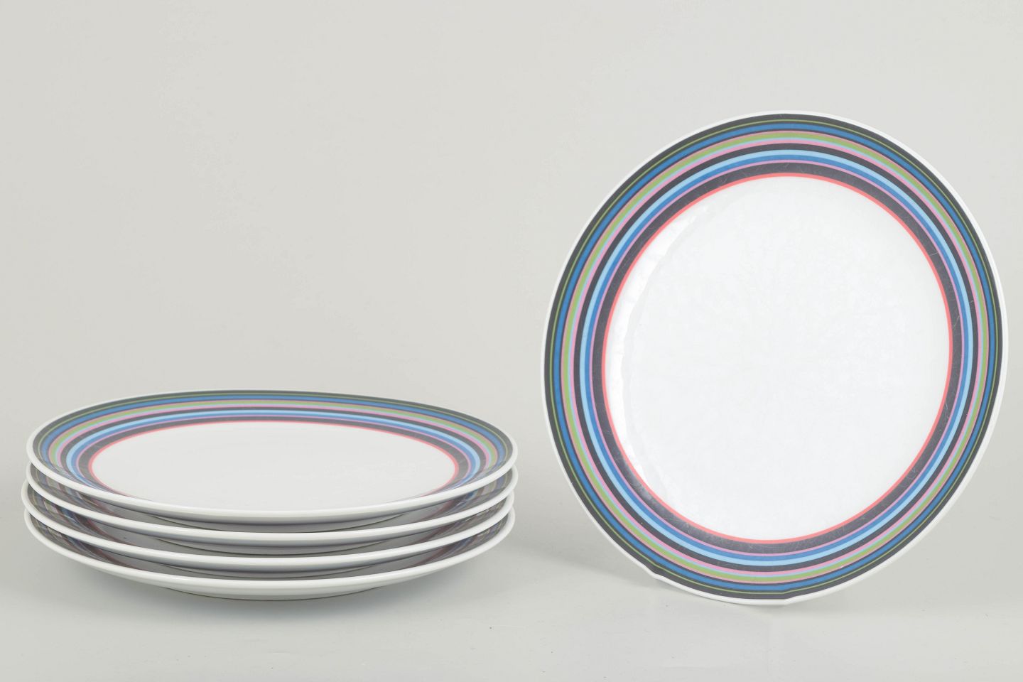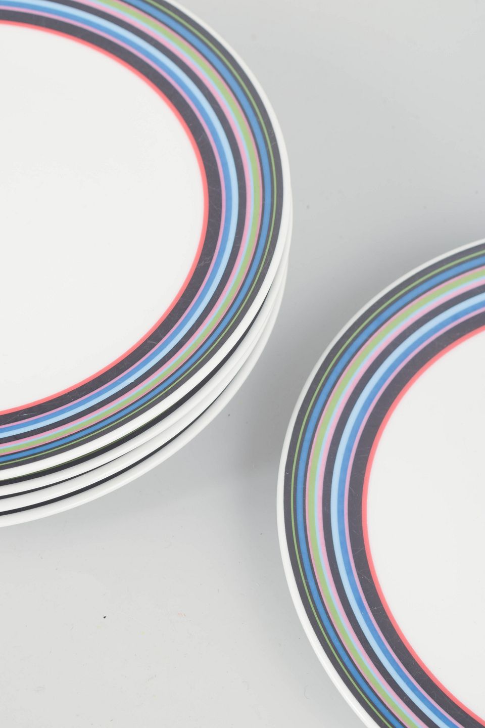 Set of five porcelain plates featuring the distinctive multicoloured striped pattern designed by Alfredo Häberli for Iittala. The series combines functionality with playful colours and timeless form, making it a modern classic in Nordic design.