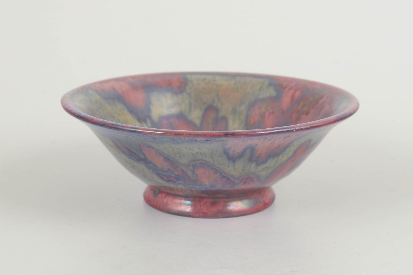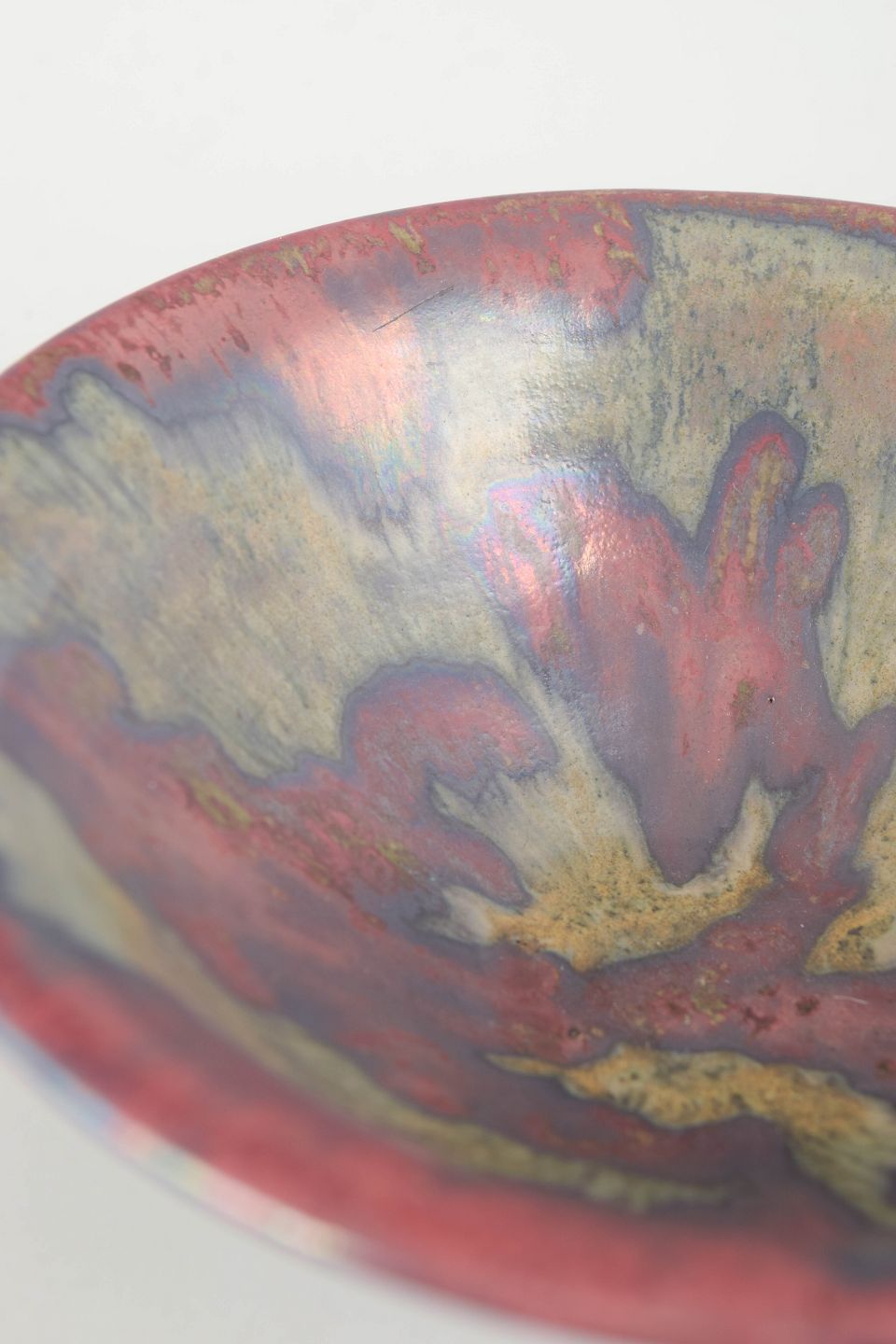 Hand-thrown stoneware bowl on a small foot with flared rim and an experimental multicoloured glaze in shades of pink, blue, lilac and green. A characteristic example of Andersson’s work for Höganäs during the 1970s, combining traditional forms with artistic glaze effects.