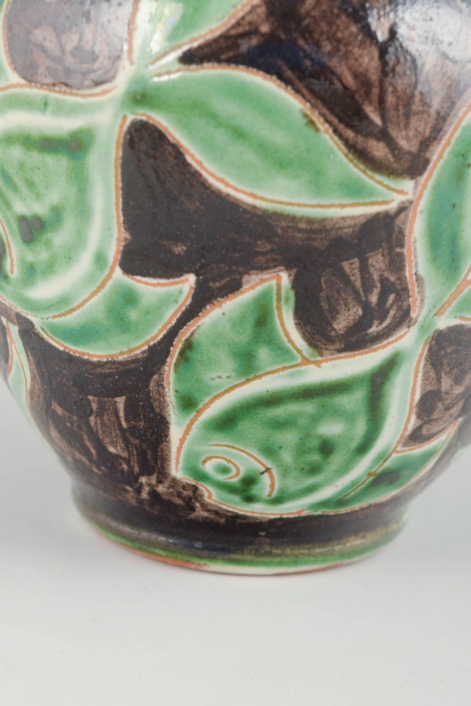 Decorative earthenware vase with relief decoration depicting fish and seaweed in green and brown tones. A characteristic example of Danish mid-century studio production with nature-inspired motifs and vivid colour contrasts.