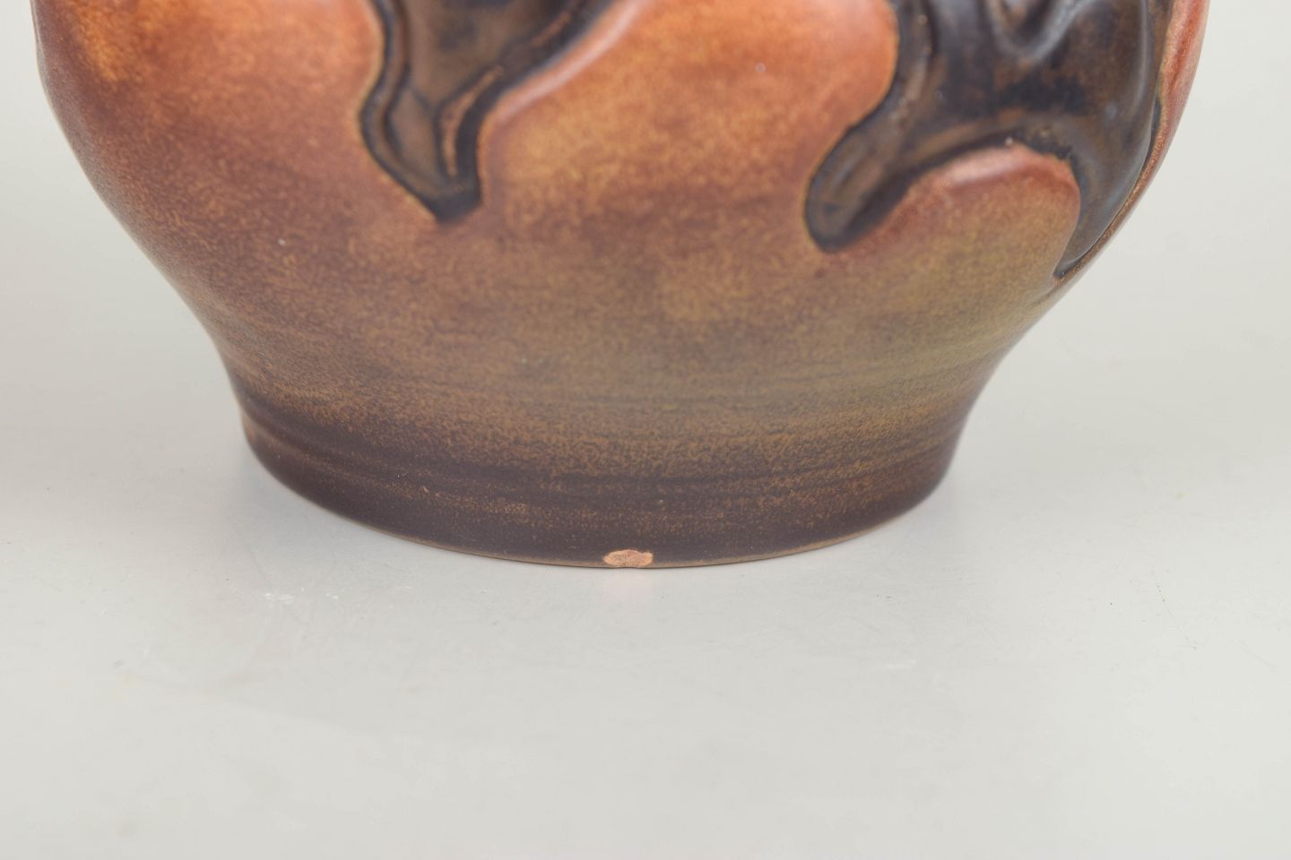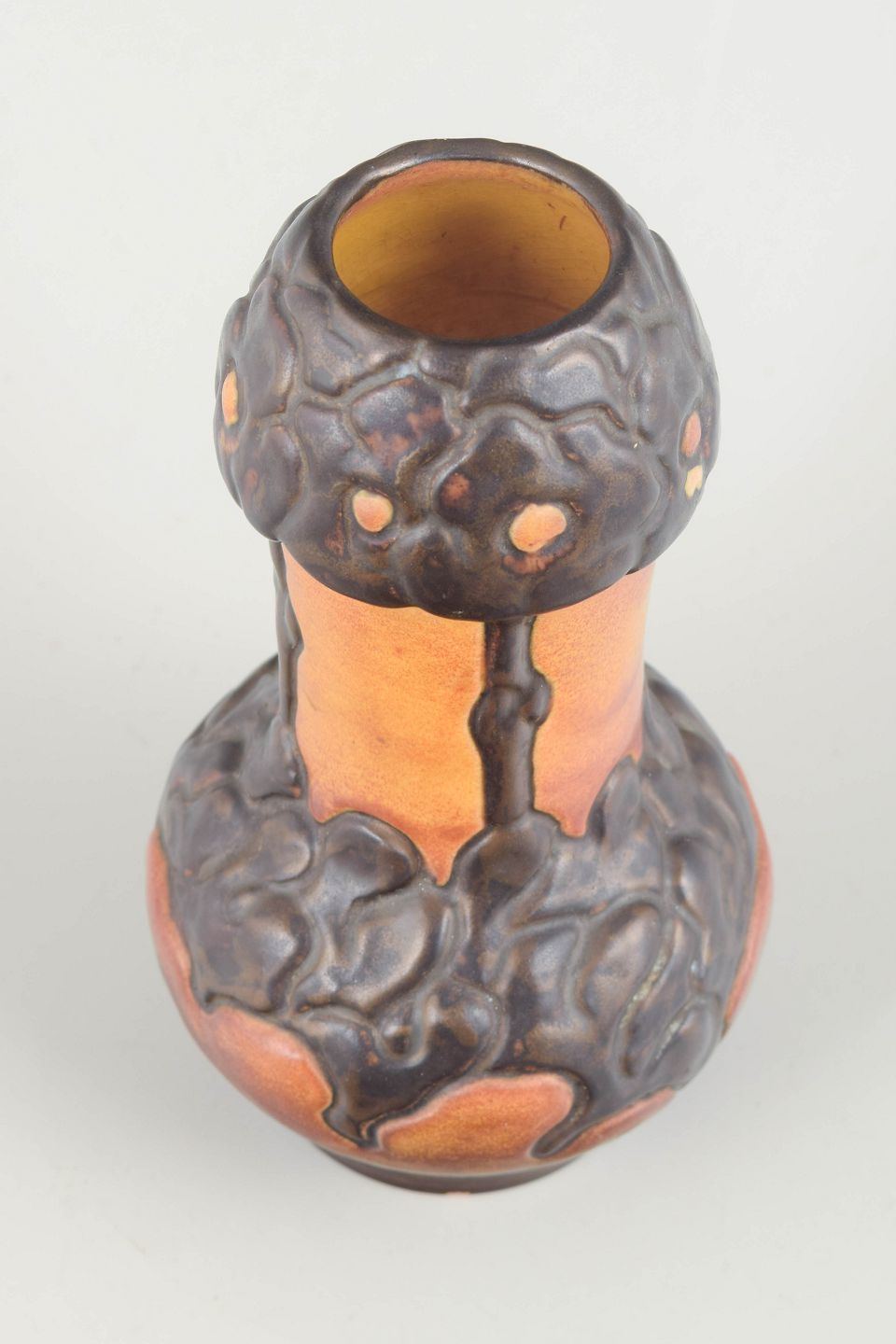Art Nouveau vase in glazed ceramic with characteristic sculptural relief decoration in dark brown glaze over a warm golden-orange base. An elegant and classic design from the period, clearly inspired by organic forms found in nature.