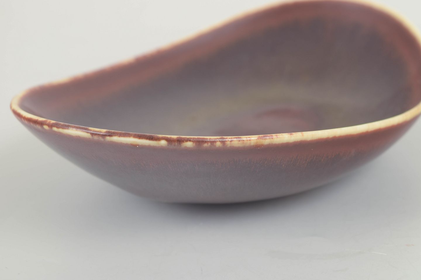 Asymmetrical stoneware bowl with a matte reddish-brown glaze showing olive tones toward the centre and a light rim. A fine example of Stålhane’s sculptural sense of form and subtle glaze variation.