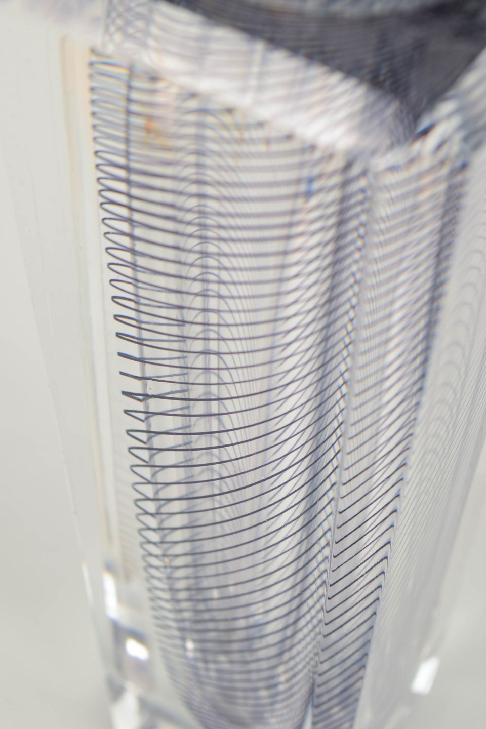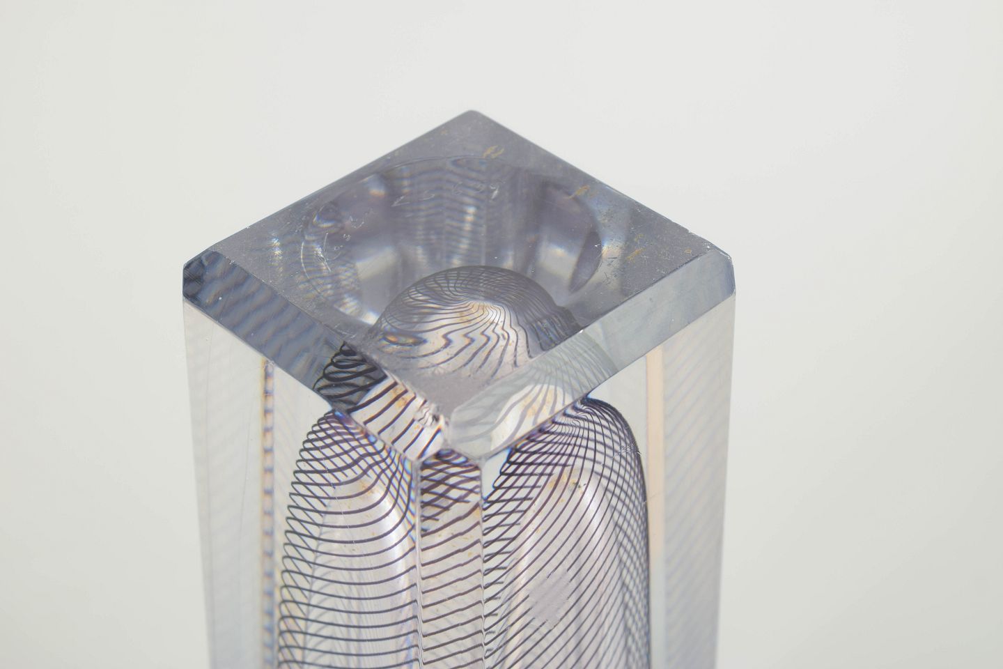 Optical vase in solid clear glass with embedded spiral black pattern, cut and polished on all sides. A refined example of Lindstrand’s late work for Kosta Boda, uniting technical precision and visual motion in a sculptural expression.