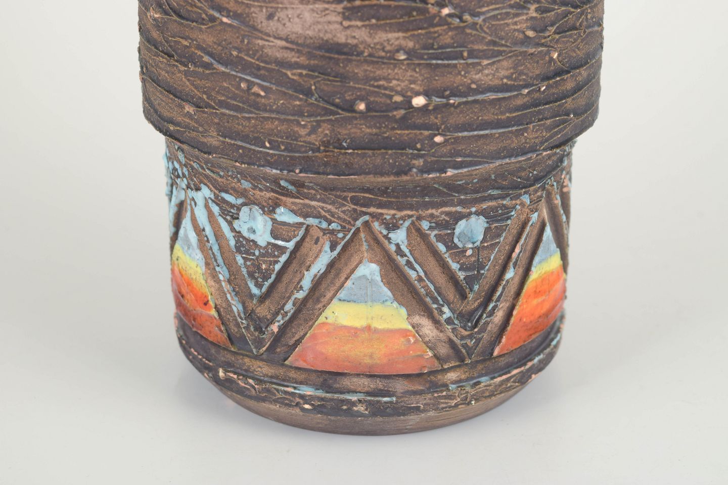 Cylindrical handmade vase in chamotte clay with rustic texture and geometric relief decoration. The surface features multicoloured lava-effect glazes in tones of red, orange, blue and brown, with a smooth glossy interior in coral red. A characteristic example of Tilgmans’ combination of raw materiality and expressive glaze work.