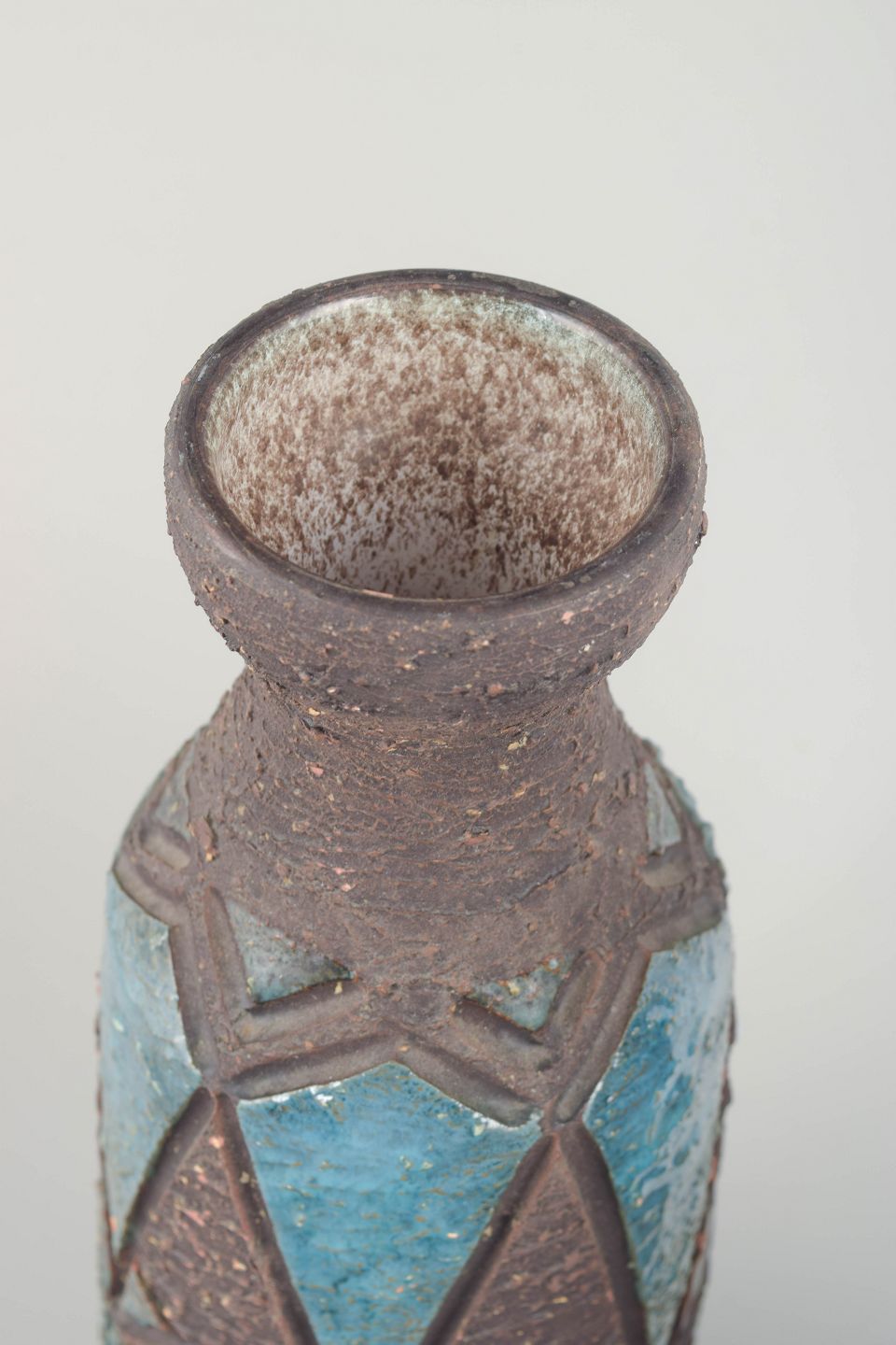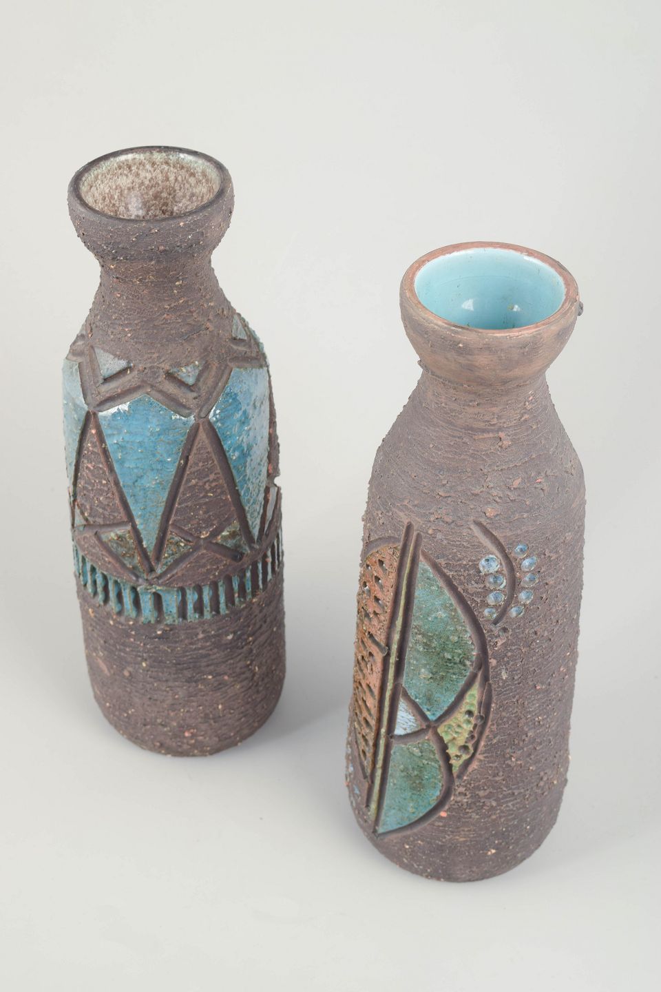 Two handmade bottle-shaped vases in chamotte clay with relief decoration and inlaid fields of coloured glaze in turquoise, green and brownish tones. Typical of Tilgmans’ rustic style with strong texture and geometric ornamentation.