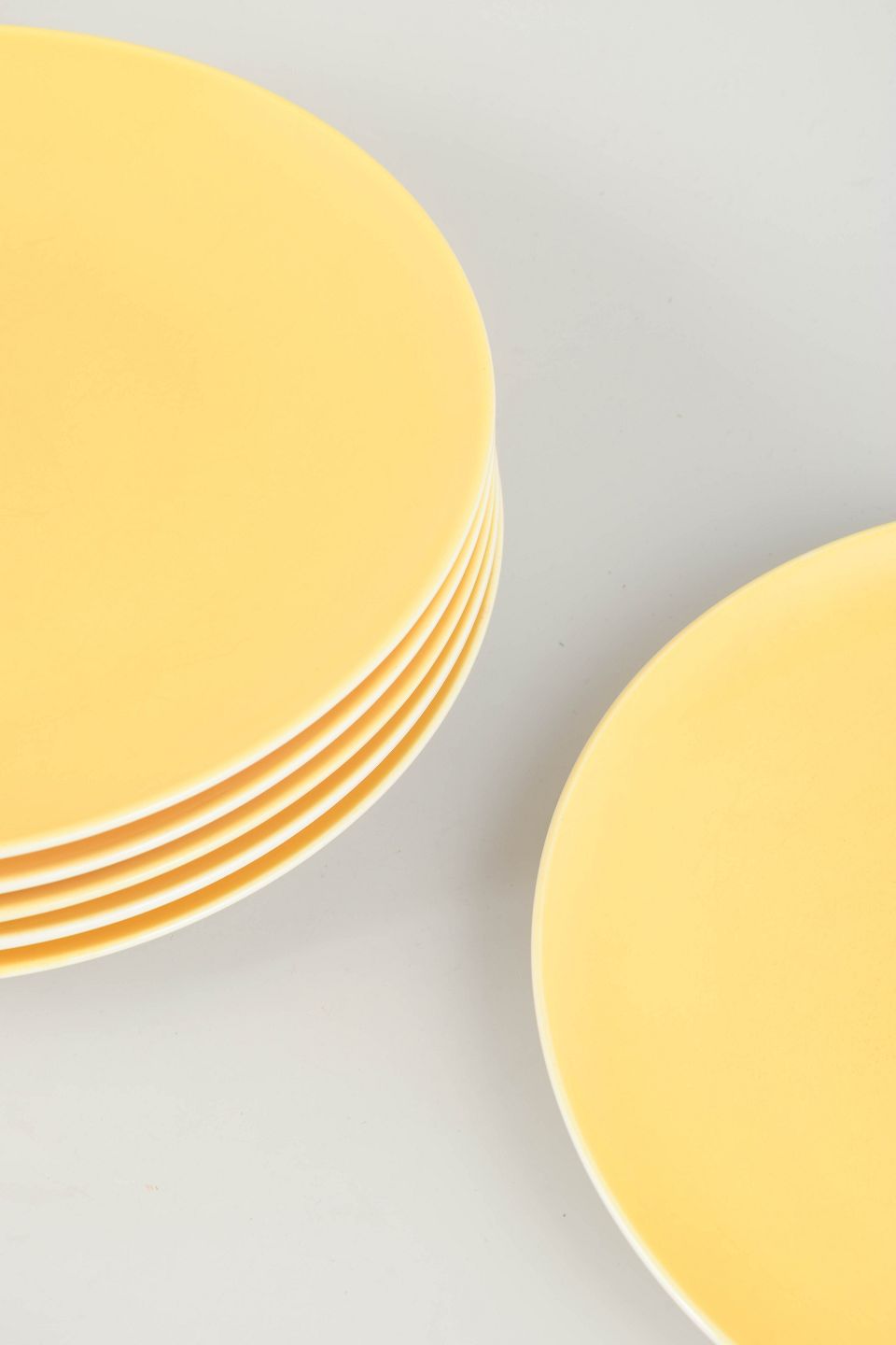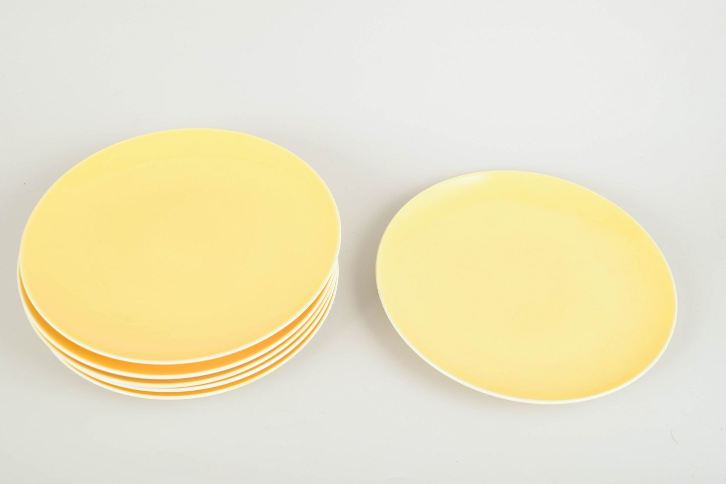 Set of six "Susanne" dinner plates in faience from Aluminia, in the signature yellow “Confetti” glaze. A refined and minimalist design with smooth contours and glossy finish — a classic example of Danish functionalist tableware from the period.