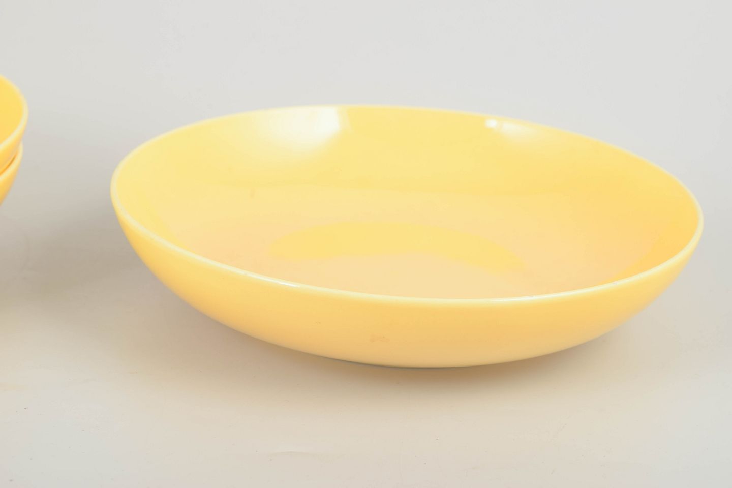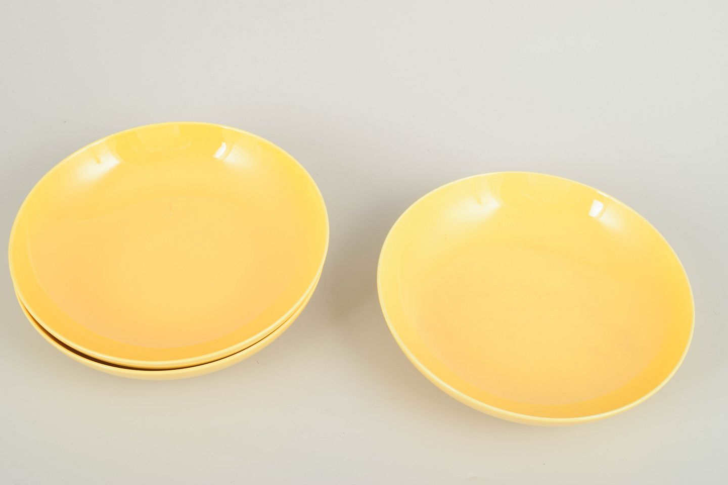 Set of three large deep faience plates from Aluminia, model “Susanne”, in the iconic yellow “Confetti” glaze. A Danish design classic with a cheerful and modernist aesthetic characteristic of the period.