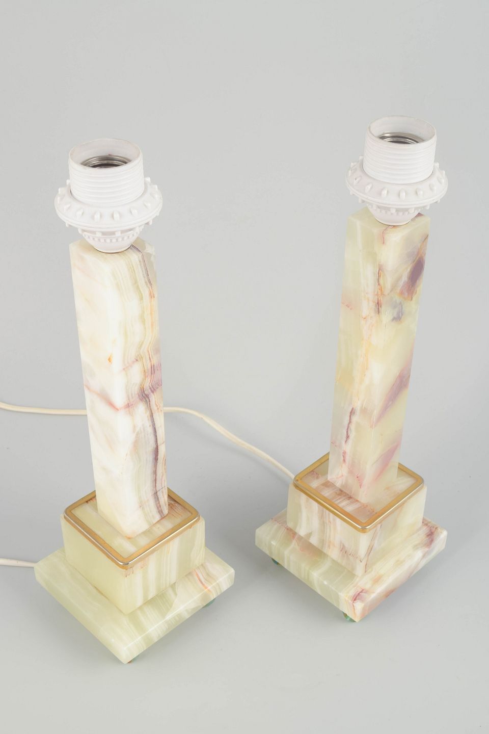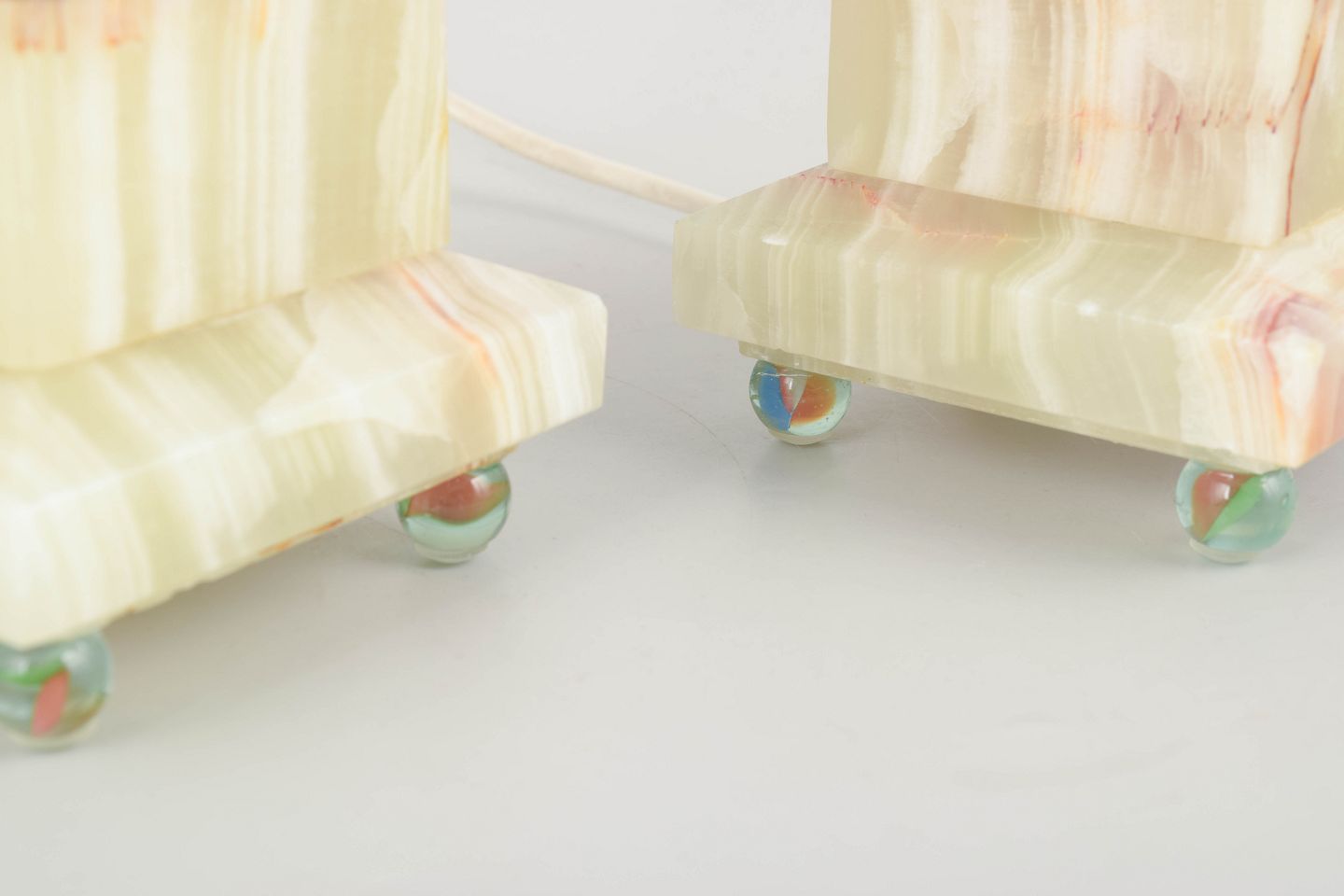 Elegant pair of polished onyx table lamps with natural veining in soft green, pink, and cream tones. Brass detailing at base and top, mounted on small glass ball feet. A fine example of Italian craftsmanship rooted in Volterra’s stone-carving tradition.