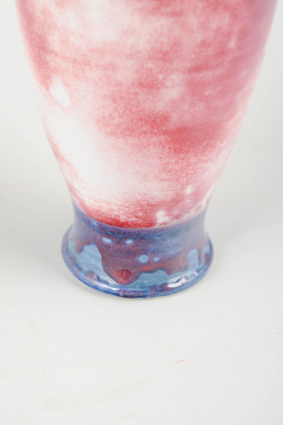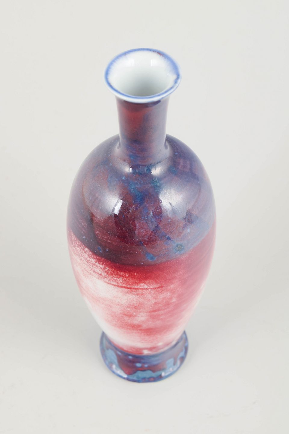 Elegant cylindrical porcelain vase with experimental test glaze in shades of red, white, and blue. Tall, slender form with rounded foot and tapering neck. A unique piece from Rörstrand’s studio, produced as part of glaze tests in the mid-1980s.