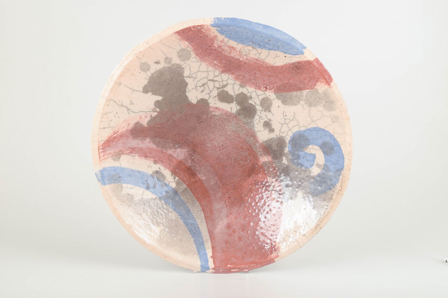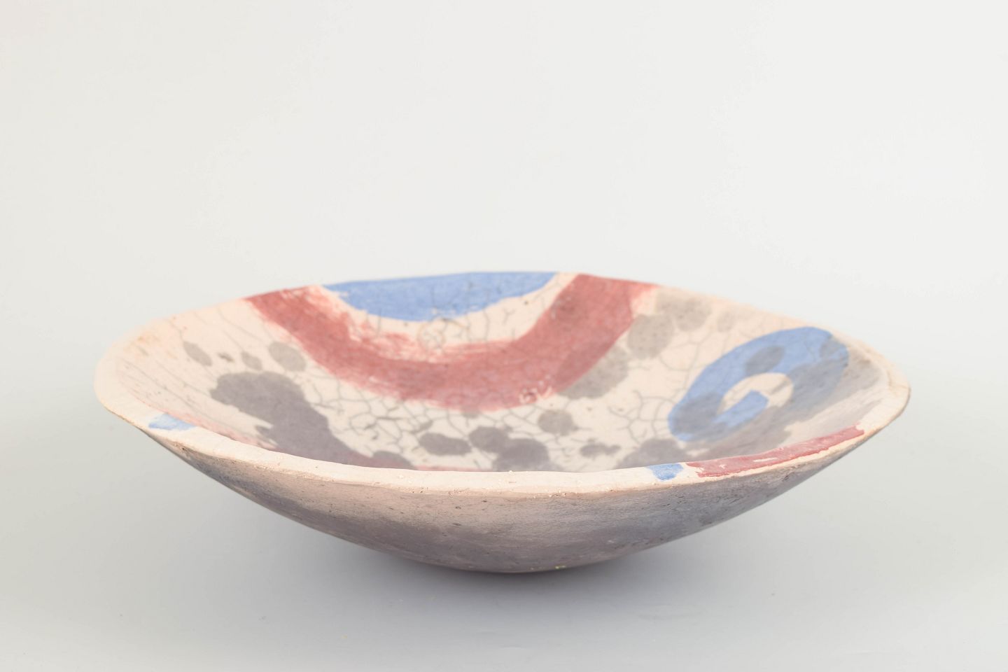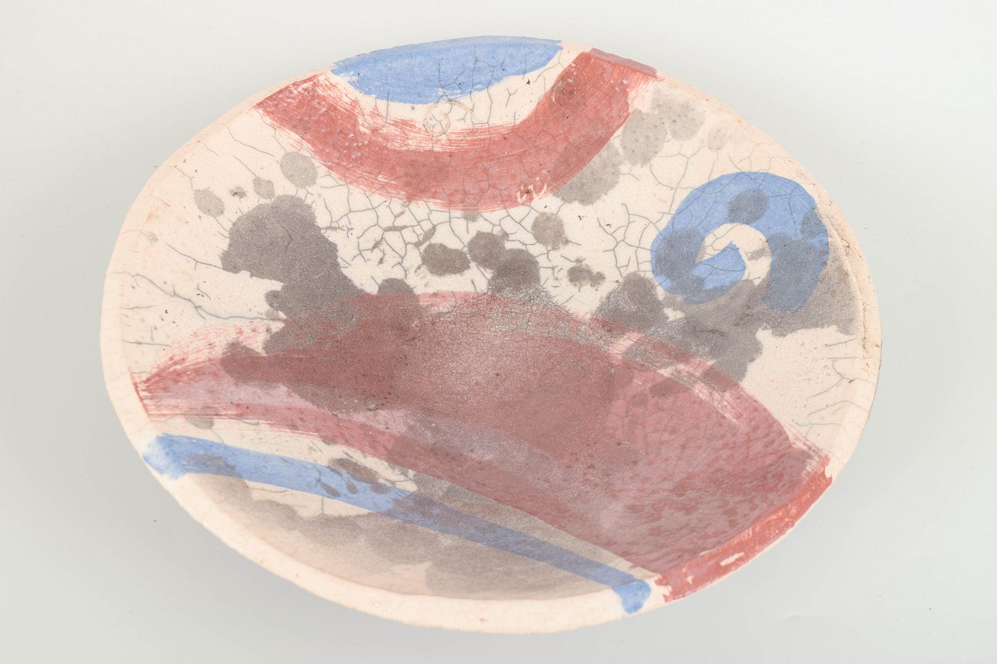 Wheel-thrown bowl with abstract decoration in red, blue, and grey tones over a crackle-glazed surface. Signed by the artist on the underside.