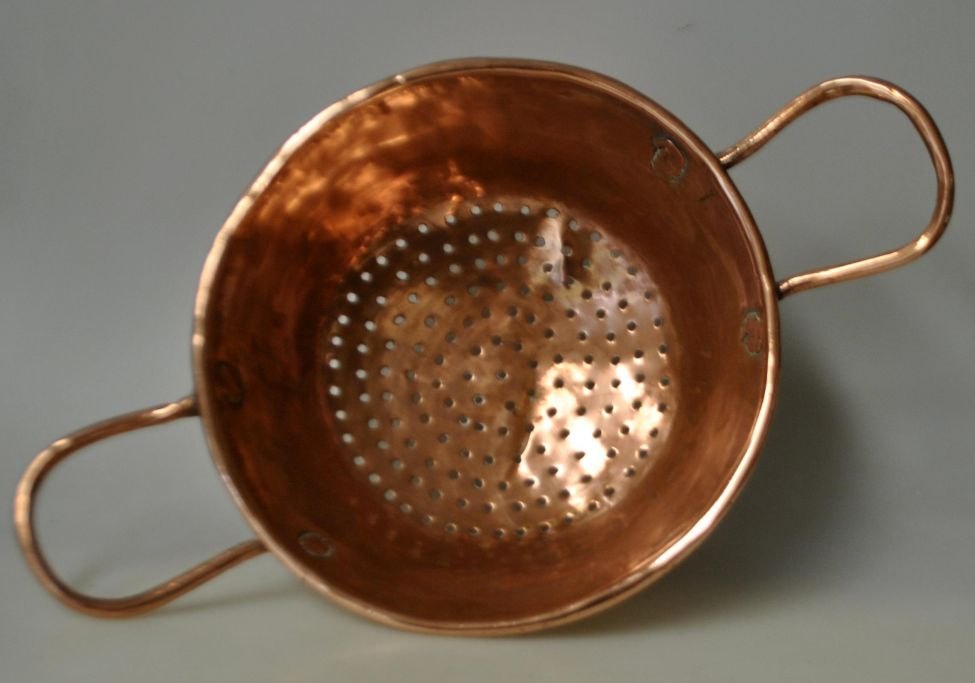 Copper colander, 19th century. Denmark. Unstamped. L: 35 cm. H.: 9 cm. Dia.: 21 cm.