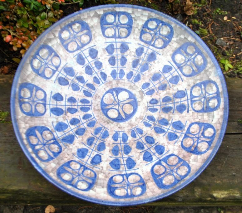 Michael Andersen & Søn ceramic dish no. 4106-3, Bornholm, Denmark, after 1930. Decorated in blue/grey shades on a mosaic base. Signed MS and stamped with three fish. Dia: 40 cm.