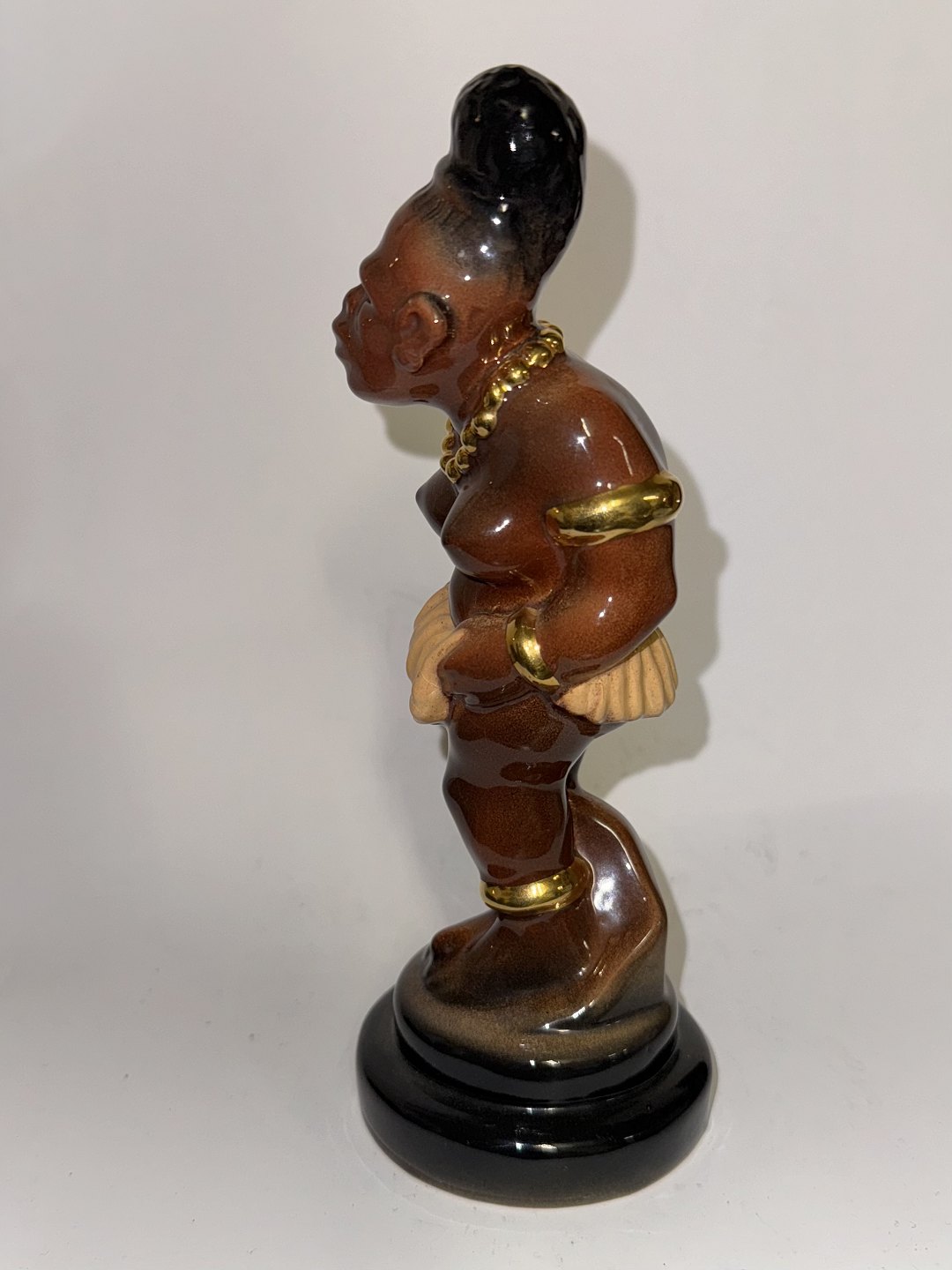 Ceramic figurine of an African woman in a skirt. Made at the Bornholm ceramics workshop Johgus. Appears in good condition. Signed by the artist on the back. Factory mark on the bottom. H. 21.5 cm