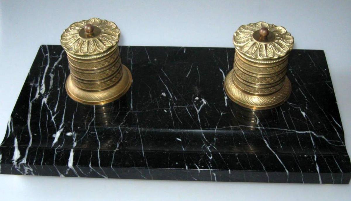 French writing set in gold-plated bronze and marble, 19th century. With brass balls. L .: 35 cm. B: 19 cm. H: 12 cm.