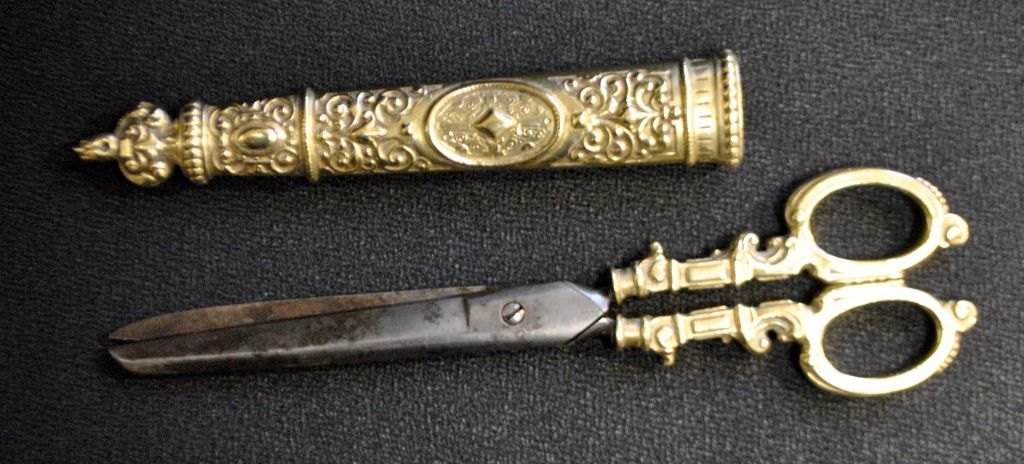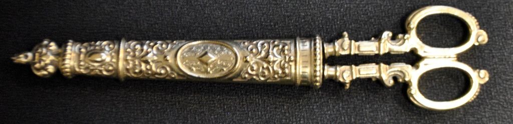 Brass scissors in decorated brass sheath, 1880. L. 26.5 cm.