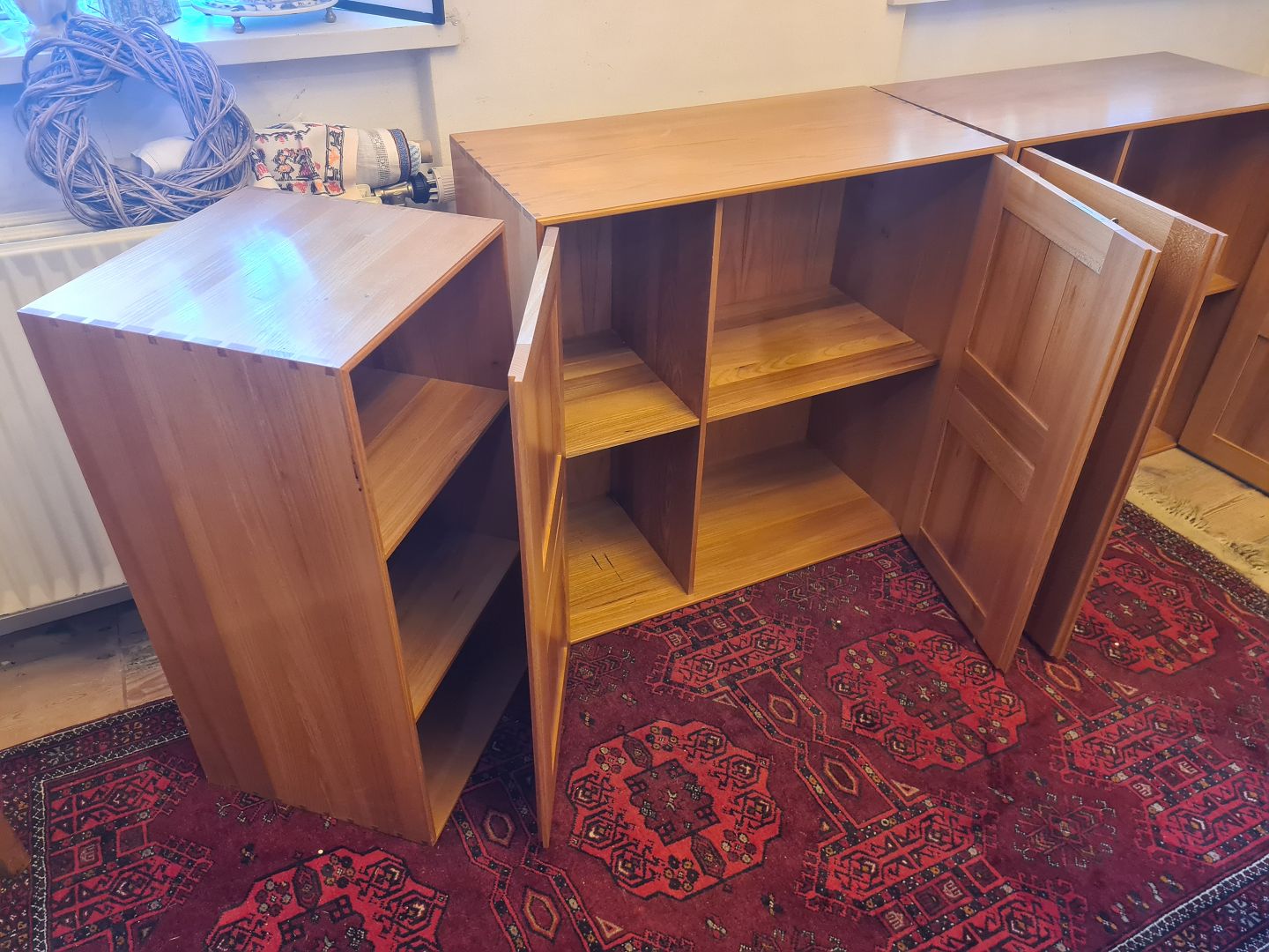 Text available in Danish: Mogens Koch skabe samt en halv reol udført i massiv Elm for Rud. Rasmussen. Fremstillet Ca. 1970’erne.