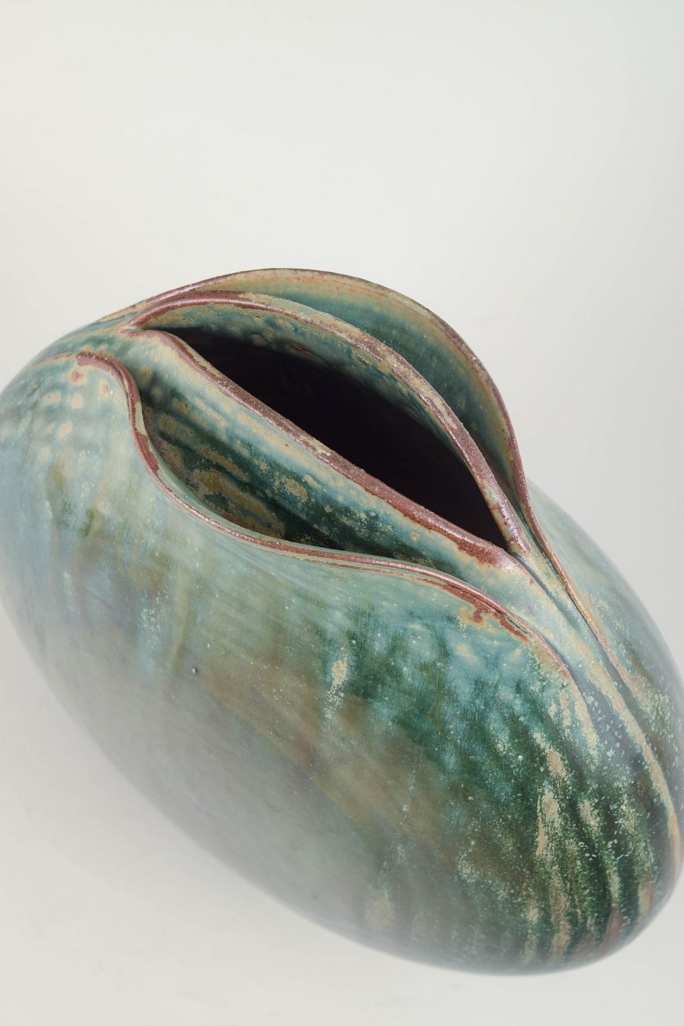 Studio ceramics in the 1980s often embraced sculptural and expressive forms, with many makers exploring organic silhouettes and natural surface movement. Glazes were used not only decoratively but as an active part of the form, creating dynamic surfaces and depth. Pieces like this illustrate the era’s shift toward freer abstraction and individual artistic expression within European ceramic art.