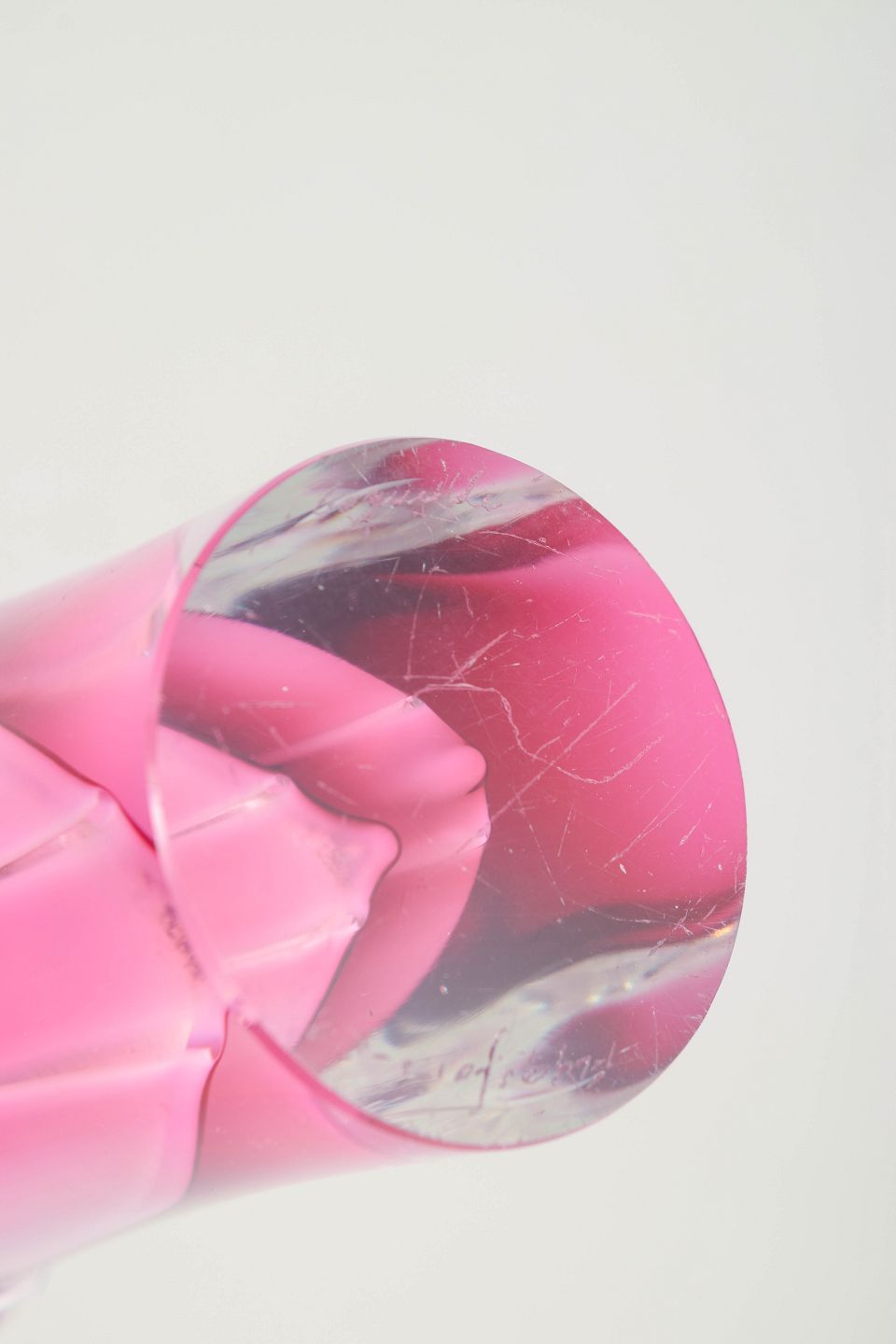 Sculptural “Coquille” vase in clear glass with inner layers of pink and white, characteristic of Kedelv’s organic design language at Flygfors.