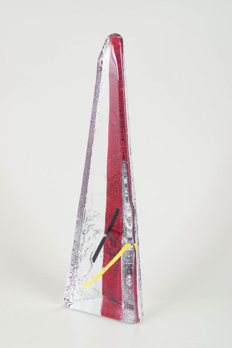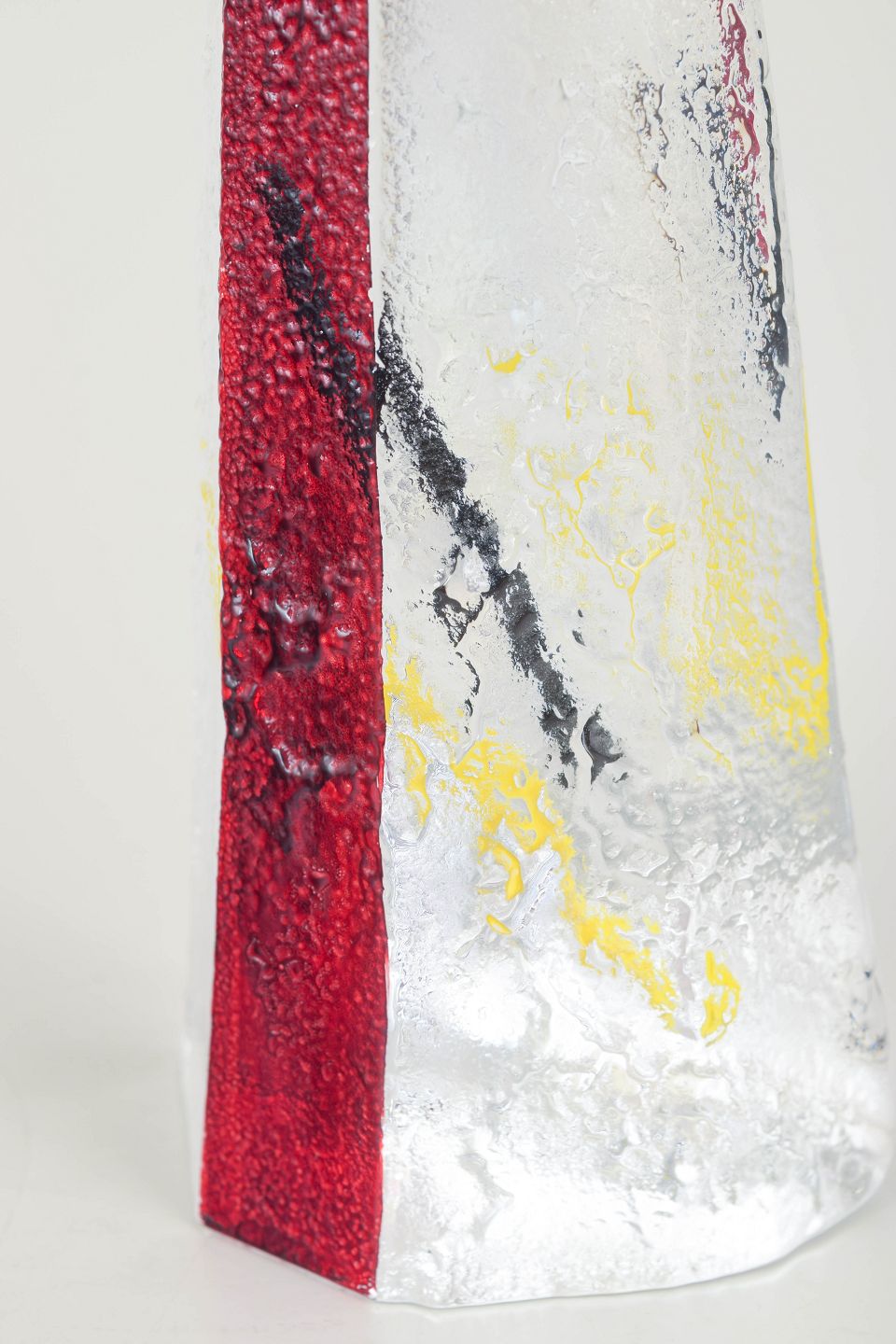 Tall triangular art-glass sculpture in clear glass featuring a bold red internal core with yellow and black colour accents. Original Johansfors Sweden sticker preserved.