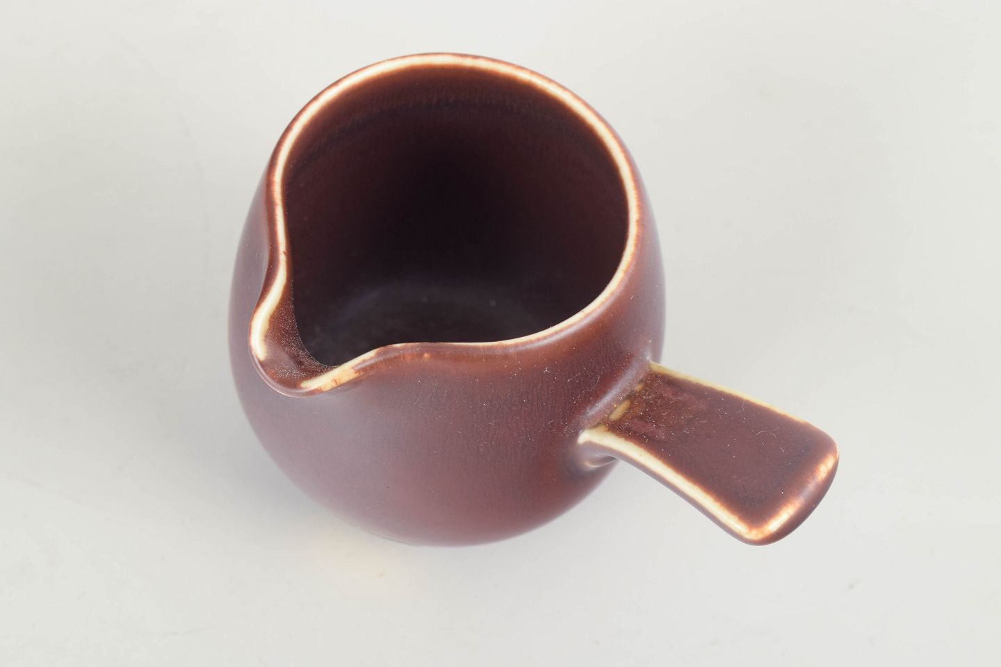 Elegant small creamer in a warm reddish-brown matte glaze with a rounded body and distinctive side handle—hallmarks of Nylund’s sculptural yet functional design. The soft glaze transitions and organic lines give the piece a refined modernist character.